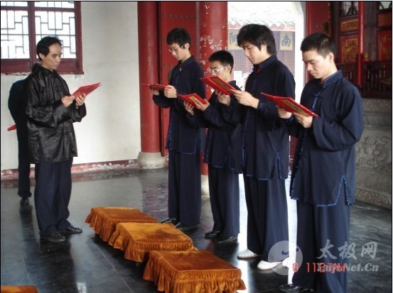 | 孙师傅宣读门规 在镇江大港企业家协会副会长、港南电子董事长聂总精心策划以及绍隆禅寺法隆禅师的大力协助下,大家首先在绍隆禅寺大雄宝殿敬拜佛祖,向佛祖上香叩拜。随后在念经堂,由聂总主持了拜师仪式: 仪式开始第一项,武氏太极拳第五代直系传人孙建国老师向武禹襄祖师、李亦畬宗师、李逊之师公、李锦藩师爷灵位上香,然后携弟子行礼叩拜。之后,众弟子立下誓言,愿继承前辈优秀文化遺产,将武式太极拳发扬光大。 |