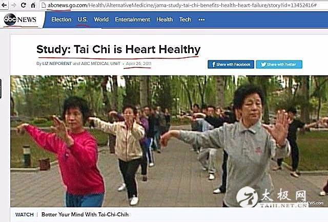 发表于世界著名医学期刊《内科学文献》的来自贝斯.以色列迪肯尼斯医学中心(哈佛医学院教学医院之一)和哈佛医学共同发表的研究显示:太极有利于心脏健康。这项研究的内容被刊登于2011年美国的顶级媒体ABC。