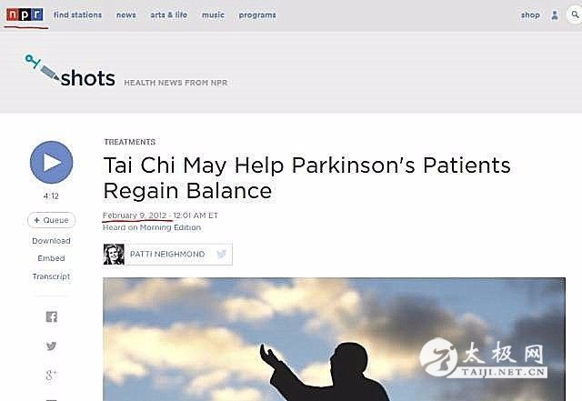 这是2012年2月发表于被学英语的人们膜拜的NPR的报道:太极可能帮助帕金森症的患者重新过得平衡。而这篇报道引用的研究来源于发表于世界顶级医学杂志《新英格兰医学杂志》的一项美国研究。为什么惜字如金的这些每次会屡屡报道太极?