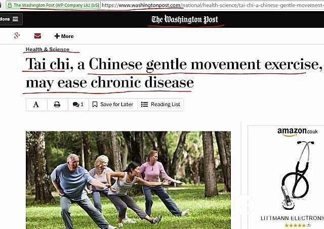 美国华盛顿邮报:太极(一种中国式的舒缓活动锻炼)可以减轻慢性疾病。