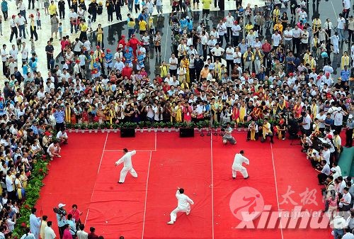 河南温县陈家沟村中国太极拳博物馆前举行的陈氏太极拳表演(8月21日摄)。