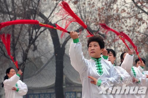 河南焦作市太极拳爱好者在为游客做太极拂尘表演(2月6日摄)。