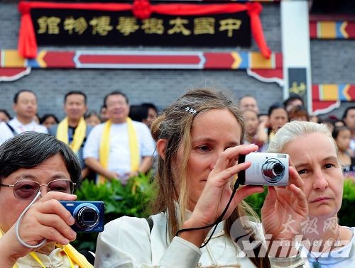 中外游客在河南温县陈家沟村中国太极拳博物馆门外欣赏太极大师们的表演(8月21日摄)。