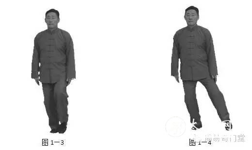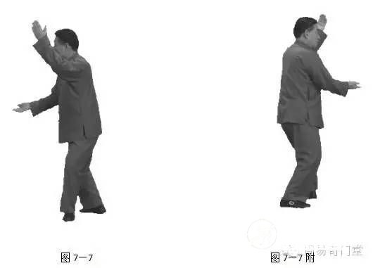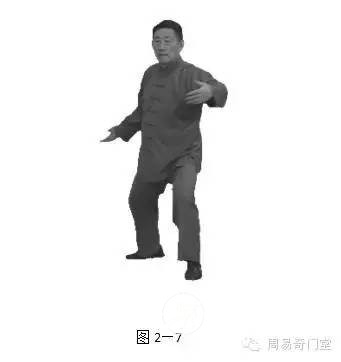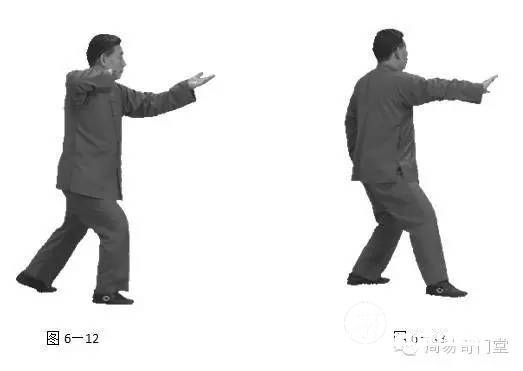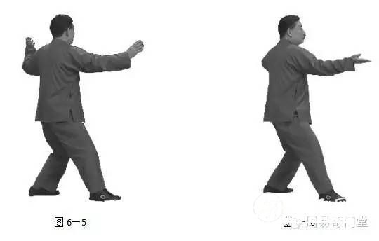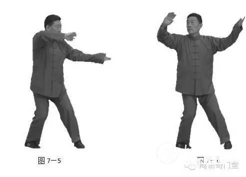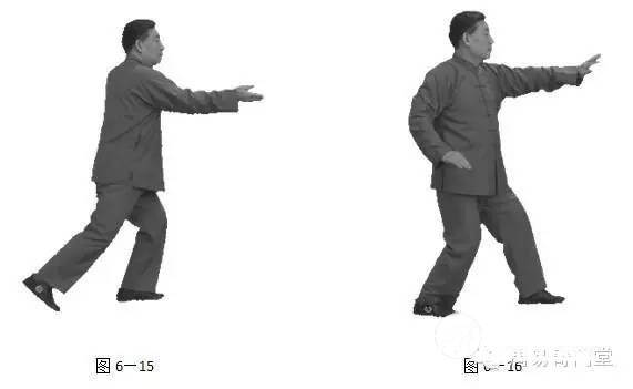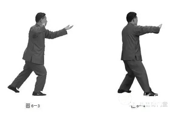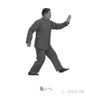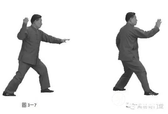 动作五: 重心前移至左脚,随即提起右腿向右前方30度前上一大步,脚跟着地,同时左手向下、向后划至左大腿外侧,手心朝下,右手随身体移动向右前方推出。(图3—7、3—8)。