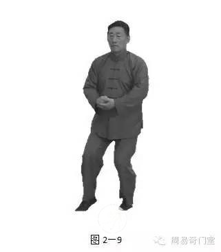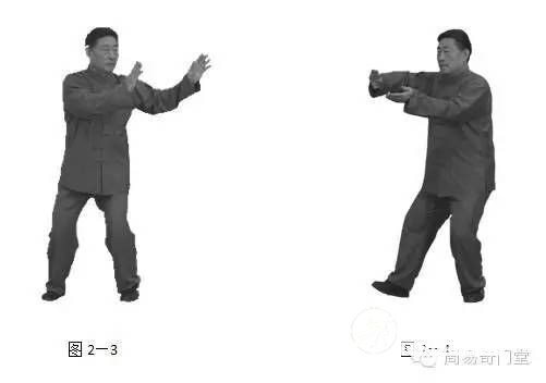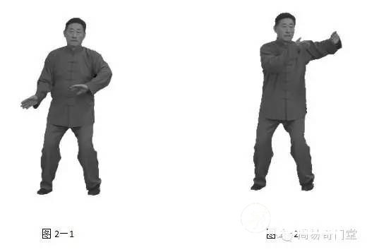 动作一:身体先右微转,再转左,重心往右移,两手随身体微左转向左前上方划弧(左手大指往外转,右手小指往里转)与肩同高,(图2—1、2—2)。