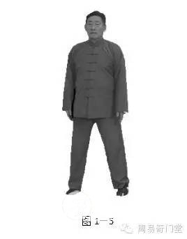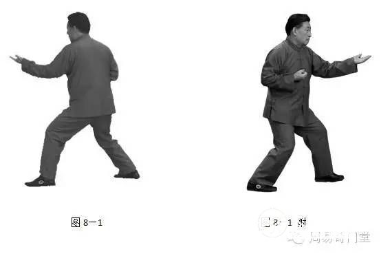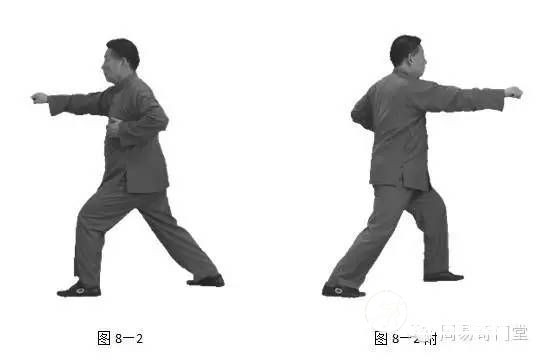 动作一:重心右移,提左腿向左前开一大步,脚跟着地,左手微内旋,右手变拳收于右腹前。(图8—1)