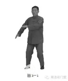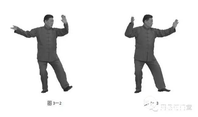 动作一:身体微右转,右拳变掌随身体向右划弧,掌心向后,左手内旋上抬至胸前,掌心向下。(图3—1) 动作二:身体左转,重心往右移,左脚尖外摆,两手随身体由右起再向左前上方划弧(左手大指往外转,右手小指往里转),左手至左前方,右手至右耳旁。(图3—2、3—3)。