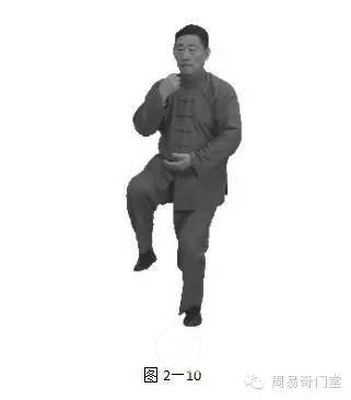 动作五:右脚提起向右前方上步,脚尖点地,左手先前再上后向内下落,右手由后向前与左手相合,左手位于右小臂中部。(图2—8) 动作六:左手内旋下落至腹前,掌心向上,同时右掌变拳 落于左掌内。(图2—9) 动作七:右拳、右脚同时向上提起,重心不起,左掌略下沉。(图2—10) 动作八:右脚落地震脚,同时右拳砸拳落于左掌心内。(图2—11) 要点:练习时以身领手,达到上下相随、节节贯串。注意手法的同时,也注意身法。左足向左前伸出,要如临深渊、如履薄冰,轻而不浮。右拳落于左掌心内,与震脚要协调一致,劲整、气下沉。