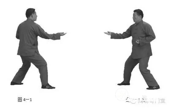 动作一:左掌变拳内旋收于腹前,右掌内旋掌心向上。(图4—1)