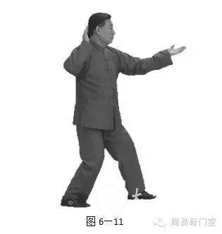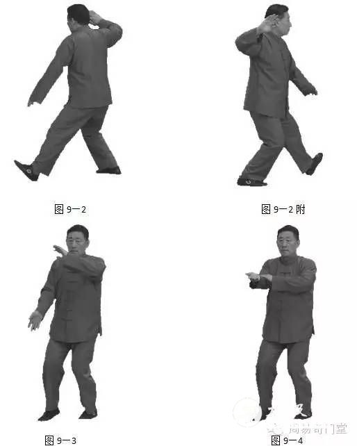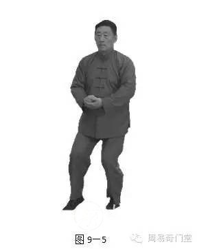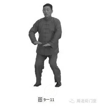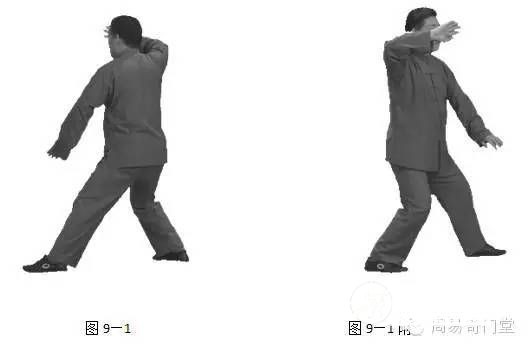 动作一:身体右转,重心右移,同时左手外旋划至左下方,右手外旋划至右上方,略高于肩。(图9—1)