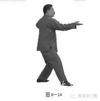 动作六:抬左脚向左后方撤一大步,重心左移,同时先合手后分手,左手向后下划弧至身体左侧,右手向前推出。(图6—12、6—13)