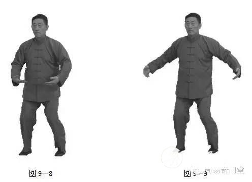 动作六:右拳变掌,双手同时由两侧向外分开,掌心相对。(图9—8、图9—9)