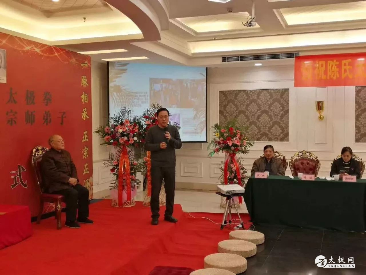 仪式由陈氏太极拳第十二代传人谢宗奇主持。主持人首先介绍了崔广博老师的习拳经历。崔广博老师生于1950年8月,河南省焦作市博爱县人。自幼随祖父习练太极拳忽龙架,随外祖父侯振田习王堡枪术。1975年师从陈正雷先生,系统学习陈氏太极拳械。四十年来,崔老师练功不止、笔耕不辍,多次获河南省市级太极拳、剑、枪第一名,发表论文二十余篇,出版专著《陈式太极拳修练精要》、《陈式太极拳教与学》两部,被载入《博爱县志》、《中国民间武术家名典》、《中国武术名家·名校通鉴》等。