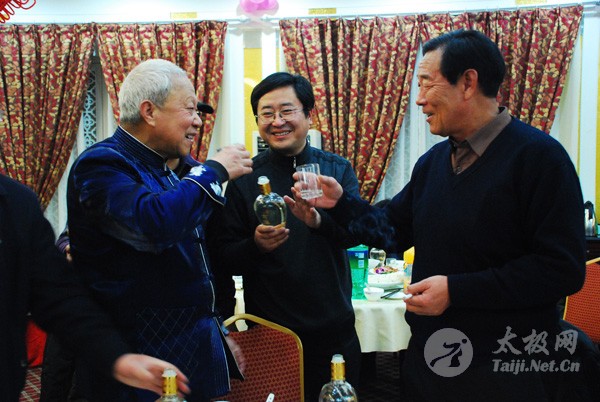 带着新年的喜悦心情,大家推杯换盏,畅谈太极拳的未来发展。和式太极拳代表人物和有禄说,不管是陈式还是和式,都起源于温县,都是温县的太极拳,得到大家的一致掌声。郑悟清拳法传人王根念说,他是首次参加各流派参加的集体聚会,感到非常高兴,希望将来多举办这样的活的,促进各流派之间的和谐发展。