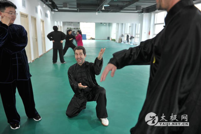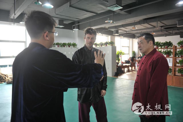(太极网报道)2月5日上午,西安东郊一家太极拳馆迎来了两位高鼻梁、蓝眼睛的外国人,俩人在陈氏太极传人陈西鹏老师的带领下,和其他学员一起在专心练习太极拳。 温森特来自法国,今年44岁,在法国是一位化妆品经销商,学习太极拳已经有7年时间,这次是他第二次专程到西安拜师学艺。 埃瑞克也是来自法国,今年41岁,他的职业是一位冲浪教练,据他介绍,他7年前就开始喜欢太极拳,这次来西安拜师学艺是他的第四次西安之旅。 63岁的陈西鹏老师,是陈氏太极拳第十二代传人,从小跟随父亲陈全忠学拳,如今弟子已经遍布世界各地,前来拜师学艺的络绎不绝,今天,两位法国弟子再一次从千里之外来到拳馆,让他格外高兴。 温森特性格十分开朗,当得知自己的同伴是一位帆船教练时,立刻做出敬仰的动作,然后用双手模拟帆船冲浪的动作,形象告诉中国的朋友埃瑞克的职业。 两位来自法国的太极拳爱好者使用的语言是法语,老师和他们交流遇到了困难,好在团队里有懂英文的学生,师生之间和弟子之间可以用简单的英文交流。埃瑞克还不时地学习汉语,来中国这四次也学会了不少汉语单词。 温森特和埃瑞克在法国同一家中国太极拳拳馆里学拳,虽然同在一个城市,但他们并不认识,这次分别来到中国拜师学艺,并在同一个老师门下,让俩人十分惊讶,俩人很珍惜这次相识,抓紧点滴时间切磋交流。 埃瑞克在法国学太极拳时,就萌发要到中国来学习的念头,他说,太极拳发源中国,学习太极拳就一定要到发源地去,这样才能学到正宗的太极拳。 温森特和埃瑞克都是自费到陈师傅拳馆学习,每次都要在拳馆学习半个月之久。两人学习十分刻苦,休息时还在一起切磋练习,让很多中国的学员感动。