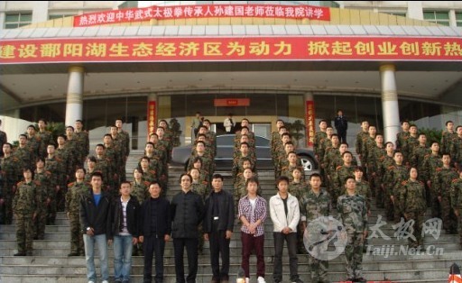 2010年4月22至5月1日南昌《航天》理工学院特邀中华武式太极拳传承人孙建国老师莅临学院讲学。经校务处研究决定聘孙老师为本院客座教授,由南昌《航天》理工学院法人代表邱小林院长亲自颁发证书。为期近十天的讲学和考察活动圆满结束,讲学期间赢得了全体南昌理工学院军训教官及师生热烈欢迎及赞扬,收到非常满意的效果。 孙老师于4月23日在南昌理工学院英雄校区二楼会议厅就如何使太极拳文化与校园文化有机结合事宜进行研讨。参加研讨会的有院校学工处处长黄学光,院校行政办公室主任赵波,院校军训部副部长肖远仁,太阳能光电学院副院长邓朝宏,院校宣传科科长王瑞等。作重从以下个方面进行:第一,演讲太极文化及武术与大学文化有机结合使学员德、智、体、武全面发展并积极响应国家教学大纲号召。第二、演讲传统武氏太极拳的渊源及特点。传统武氏太极拳为文人所创,文人所传,文人所练的太极拳,将太极拳文化与校园文化有机结合,打造(航天)南昌理工学院独具特色的一流高等院校。第三,在院校大体育舘向全体军训教官亲身演练武式太极一路中捋架,太极二路炮捶部分套路。 讲学结束前,孙老师在(航天)南昌理工学院大门口亲自传授军训学员部分太极拳动作招式及身法要领,让学员在掌握一些太极拳要领同时感受太极身法的内含。大家都热情高涨认真学习收到很好的效果,学员们希望以后能有更多机会学到更多的太极文化真谛。 院校宣传部积极配合拍摄录像和合影留念