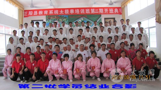 8月8日下午,正阳县教育系统第二期太极拳培训班第三批学员的开班典礼在大春太极山庄演武厅举行。这是自7月8号以来,本年度教育系统太极拳培训班的最后一批学员,按预期他们将在山庄进行为期15天的太极拳培训。 去年,依托大春太极山庄,正阳县教育系统的180多名专兼职体育教师分三批完成了每期10天的太极拳培训。按县教体局规划,今年将在这里再培训200多名各乡镇学校的专兼职体育教师,共分三批,每期15天。结业后,他们将作为本县教育系统普及太极拳的教练,承担起各校太极拳普及推广的任务。 在全县中小学中普及推广太极拳,将这一充满哲理和智慧的拳种列为中小学的体育考核项目,是正阳县教体局在县委县政府支持下的一项战略性决策,旨在加强学生的体能,启发智慧,实现德智体的全面发展。 在完成教练员的培训后,他们将利用举办各种赛事的方法,着力抓好普及工作的落实,力争用二至三年的时间,使太极拳成为正阳教育的一大特色。