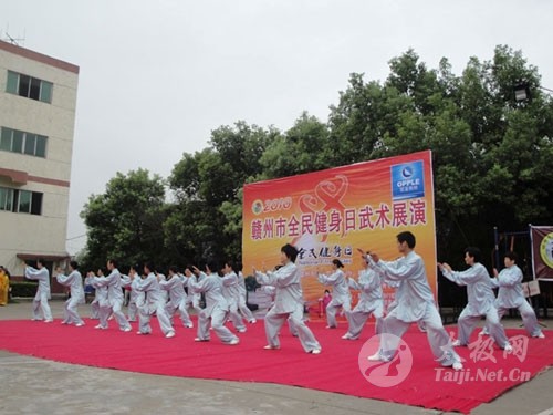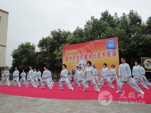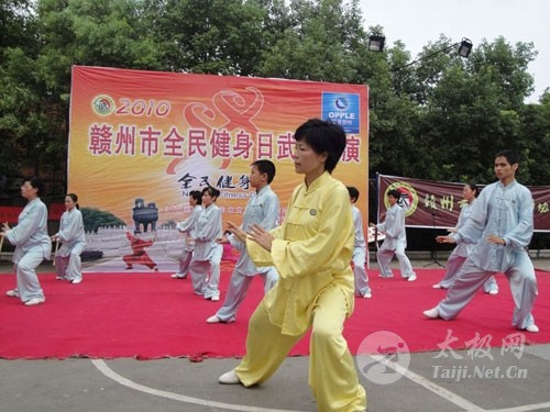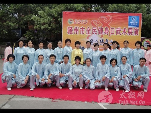 8月6日上午,江西赣州市举行全民健身日武术展演,迎接8月8日我国全民健身日。赣州永萍太极养生俱乐部的30多名成员和市铁路俱乐部、老年协会、市区各晨练队、市区各太极协会组织,武术馆等共十多个组织的上千名武术爱好者,参加了这次由赣州市体育局、市武术协会主办的这次活动。 这次他们参演的项目是:太极拳缠丝桩 和陈式太极拳老架一路。在吴永萍的带领下,会员们飘逸舒展的拳姿和深含文化内涵的解说,令当地广大武术爱好者对太极拳的理解耳目一新,赢得了一阵阵热烈的掌声。他们的表演,引起了赣州晚报、电视台等当地新闻媒体的注意,并作了相关报道。 赣州永萍太极养生俱乐部是由太极拳名师吴永萍组织成立的。成立以来,他们以认真规范的教学方式、温馨活泼的活动氛围以及形式多样的活动方法,吸引了广大太极拳爱好者。他们通过业余辅导、开办网站、拳理讲座等形式,向广大拳友传授太极拳文化、交流学习太极拳的体会、进行陈式、杨式太极拳传统和竞赛套路及各种器械的辅导,是赣州地区一支活跃的民间太极拳组织。作为俱乐部负责人,吴永萍经常受到内蒙、山东 、湖北、福建、湖南、广东、黑龙江、吉林、北京、上海以及德国、意大利、印尼等国太极组织及“太极拳迷”的邀请,在国内外进行太极拳文化的传授。这位由安远县走出,打开当地太极拳世界性交流之门的太极拳师,以其精湛的技艺、明晰精辟的讲解方式和启人领悟的辅导方法,所到之处,遍受欢迎,被誉为大山里飞出的“太极灵凤”。