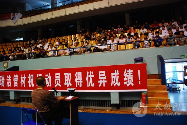 在上午来淮的外地选手中,焦作人马争辉到的最早。高挑的个子,戴着副眼镜,马争辉看上去斯斯文文。马争辉说,在郑州坐了凌晨2点的火车,他们一路风尘仆仆地赶来。这次他不但自己来参赛,还把60岁的老父亲给带来了。马争辉说,学习太极拳完全是受了父亲的影响,自从上中学时开始跟着父亲学拳,后又陆陆续续地向包括太极名师陈正雷在内的其他师傅讨教,他学太极拳已经十年有余。“有把握进决赛吗”,记者问。马争辉哈哈一笑,“以学习观摩为主。” 紧随其后的是徐州人李晓辉和东海人朱慧,二人均来自徐州龙之健武道馆,是感情很好的师兄弟。李晓辉从徐州坐火车出发,朱慧从东海坐汽车,二人约好似地同时到达。在他们报名表的门派栏里,赫然写着尊古陈式太极拳的字样,李晓辉告诉记者,他们的拳法传自陈庆洲,是一门古老的武学。 李晓辉和朱慧一黑一白,一高一矮,二人站在一块像一对“黑白双煞”,极具喜感。身高1米84体重达到240斤的朱慧戏称,自己要是和王战军遇上,说不定有的一拼。旋即他又认真地表示,其实自己只是个40多岁的武痴而已。尽管也拿过一些冠军,可年龄不饶人,这次参赛,他们哥俩更多地是要在比赛过程中感受气氛,寻找快乐。