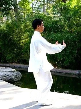 这个可以说完全是因为我们形体姿势的问题,形体姿势不是很正确。要按照正确的调形要求,站桩的时候来调形,形体调整好了就会解决这个问题。我这里说着,你方便的话做着体会一下,先是两脚并拢、周身中正站好,两脚踩气分开,呈后八字。之后,比如说你两手扣在肚脐上,或前伸环抱都可以。 我举例子,比如说放在肚脐上,把手放好之后,这时候你的身体还是直立着站着,两脚呈后八字。下面的动作最关键,你站桩,站两个小时也好,站四个小时也好,你能不能坚持下来,能不能长功夫,关键就是从直立到蹲下去的这个过程中,一定要把姿势做正确。 尽管这个下蹲的时间一分钟都不到,但如果在这个过程中你的姿势调整不好,那么后面整个的站桩过程,你都会觉得非常难受,非常辛苦,膝盖发紧也是在这个时候出的问题,我就讲一下我的体会,怎么站才比较好。 你身体站直了之后,手扣在肚脐上,脚成后八字,然后不是直着往下蹲,因为我们站桩有个要求,就是:在铅垂线的方向上(就是竖直的方向上)膝盖不能超过脚尖,这个脚尖是你脚趾的端头,我们的鼻尖不能超过膝盖。