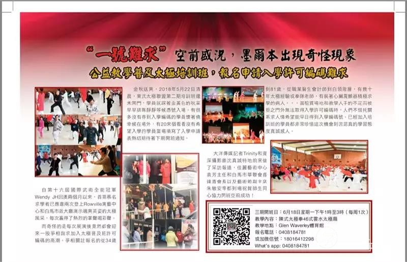 太极拳是一项传统的中国武术运动,同时也蕴含着中国哲学思想和东方处世之道,被国外友人称之为“优雅的艺术”,早已成为中华文化的一张闪亮“名片”。 为进一步促进中国太极文化在澳洲生根发芽,使更多澳洲友人加入其中,让太极之花在澳洲开得更加灿烂夺目。东武太极研修院常务院长,太极名家徐勤兰老师亲赴墨尔本开展的太极扇,太极拳,段位拳等丰富多彩的系列教学已经一周,在她的带动下,澳洲拳友的积极性很高,进步很快,在当地再次掀起太极热潮。