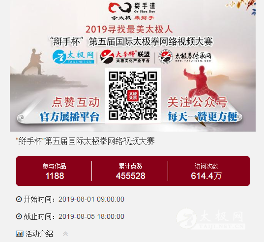 健康中国,太极同行!太极,以网会友!寻找最美、展示最美、传播最美、点赞最美! 秉承拳友支持和倡导的“永不落幕的太极拳大赛”,一年一度,广大太极人专属的“互联网+太极拳”年度盛会再次盛装起航。 “国际太极拳网络视频大赛”是创立于1997年的太极网(TAIJI.NET.CN)创新打造的太极拳网络在线交流的品牌赛事,前身起源于2005年的“焦作山水杯”国际太极拳DV大赛(太极网主办、焦作市旅游局冠名)。深耕太极文化传播20余载的太极网于2015年创新结合自媒体网络传播风潮举办视频大赛,至今已连续举办四届,引发全球拳友高度关注。赛事以“寻找最美太极人”为主题,以其强大的影响力、感召力、凝聚力席卷太极圈,通过网络掀起太极热潮。 8月1日9时整,“搿手杯”第五届国际太极拳网络视频大赛网络展播及点赞通道正式开启,太极拳爱好者一年一度的网络狂欢如约而至,太极人的朋友圈再度被视频大赛霸屏。 本届赛事口号“会太极·来搿手”,大赛规模再创新高,各地拳友和太极拳组织共2000人参赛、1188部参赛作品(含69个集体项目),大赛虽已历经四届且备战多日,本届大赛展播平台开启之时,拳友们的高涨热情依旧让人震撼,通道开启一小时,展播平台访问量飞速直逼百万,点赞量达75212次!面对汹涌澎湃的网络浪潮,组委会严阵以待,不断加强平台维护,保障平台流畅运转。 与此同时,展播平台每时每刻接收着来自全球各地数以万计的拳友留言互动,以太极之名,他们不仅为自身摇旗呐喊,也为其他拳友加油鼓劲。视频大赛如同巨大的磁力场,吸引着各地拳友的关注和传播,传递着太极正能量,蓬勃着太极拳无与伦比的生命力和魅力。 拳友们纷纷表示“太极,以网会友,视频大赛太好了”!通过网络展播活动,展示各地太极人风采,助力“太极”向全国乃至全球的品牌推广。 投票启动后,拳友们积极为心中的“最美太极人”点赞!截止发稿时,视频大赛展播系统共收到拳友互动点赞455528次,展播平台点击量破600万!展播平台访问量还在疯狂激增...... 本届大赛能否刷新或创下怎样的记录,“最美太极人”究竟英雄谁属,“最美太极团队”最终花落谁家?我们与广大太极拳爱好者共同期待和见证! |