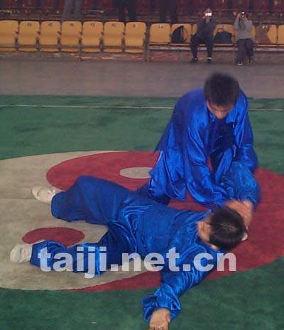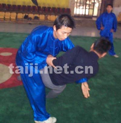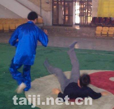 今天中午,来自日本的两位太极拳爱好者莅临温县。在参观了太极拳发源地——陈家沟以后,来到温县太极武术馆太极培训中心观看正宗的太极拳表演。在校长陈二虎先生安排下,温县太极武术馆太极培训中心的学生们为日本客人表演了传统的陈氏太极拳老架一、二路、单刀、单剑、十三枪及推手。表演之后,两位客人又要求陈校长为她们校正单剑、新架一路的动作。随行的郑州领队因没见过真正的太极功夫,要亲自和学生们一试身手,结果被频频发出。