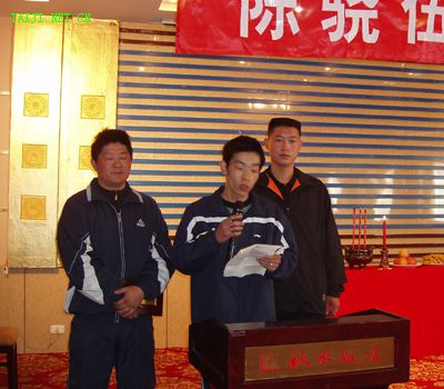 太极网总经理刘洪奇先生讲话 3月24日,焦作市槐园太极拳社社长陈骁伍先生收徒仪式在焦作秋水大酒店举行。安徽宣城的太极拳爱好者丁雪峰、刘建强自从2005年初跟随陈骁伍先生学拳以来,不远千里,多次赴焦作求教,陈骁伍先生慷慨豁达、倾囊相授,毫不保留,他们深为陈先生的拳艺和人品折服,决定拜陈骁伍先生为师。一同拜师的还有跟随陈先生学拳多年的焦作中级人民法院的王道高先生。其中丁雪峰先生习练少林拳、查拳多年,在当地小有名气,属带艺拜师。拜师仪式由河南省武协副秘书长、温县武协常务副主席原福全先生主持,来自陈家沟的当代太极名师陈素英、张福旺、陈冲、陈志强,焦作名师史潮记、郑州名师张鹏也到场祝贺。