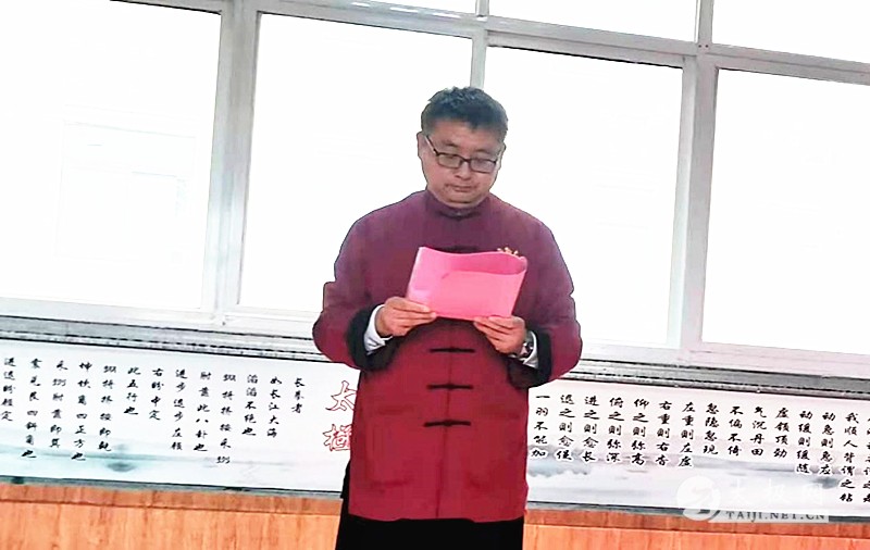 主持活动并致迎宾欢迎词 新入门弟子上前向师父、师母行鞠躬礼,师父亲自为弟子披挂中华太极拳传承人绶带。随后,新入门弟子依次向师父师母递交拜师贴、行拜师礼、敬拜师茶。