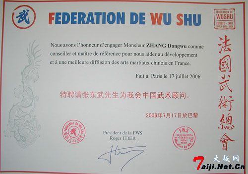 | 张东武先生2006年底结束了半个多月的法国讲学之行。 此次法国之行系应法国巴黎中医武术学院院长简柳军先生的邀请 ,近20日来在巴黎倾力传授太极技艺,在当地掀起了极大轰动。 归国后的主教练张东武意气风发,即日便赶到公司与大家热烈交流此次法国之行的收获,谈及法国朋友对太极拳的热情也感染着我们每一个人。同时他还给大家带回了另外一份惊喜,由于陈正雷大师多年来在武术界作出的卓越贡献和世界武术界的影响力,法国武术总会特聘请陈正雷大师为该会中国武术顾问,同时被聘为顾问的还有武术名家吴彬、张山、夏柏华、康戈武等人。介于主教练张东武几年来在法国积极传播太极拳以及在法国武术界的影响也被聘为该会顾问,张教练谦虚的说:“与几位大师级武术名家一道被聘为顾问很荣幸,以后还要继续努力”。