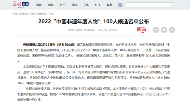 | 由文化和旅游部非遗司指导、光明日报社主办、光明网承办的2022“中国非遗年度人物”推选宣传活动,21日在京公布了2022“中国非遗年度人物”100人候选名单。丁兰英、马依热古丽·塔依热洪、王晓燕等非遗项目代表性传承人,非遗领域的策展人、企业家、艺术家,非遗管理者等100人成为正式候选人。 国家级非物质文化遗产代表性项目太极拳(陈氏太极拳)省级代表性传承人陈炳入选该名单。陈炳,1971 年出生于太极拳名门世家,太极拳发源地温县陈家沟人,陈氏太极拳第十二代嫡宗传人,现任陈家沟太极拳协会会长、陈家沟国际太极院院长、中国非遗协会太极拳专业委员会副主任。 据《光明日报》消息,本次推选活动1月14日正式启动。组委会收到各方推荐人选后,经过合规性审查,并根据参选人个人情况和专家意见,选出100位候选人(名单附后)。接下来,将由光明日报非遗传播专家委员会及专家评审团以无记名投票的方式进行复选,从100位候选人中推选出30位提名候选人;最后根据网络评议和专家评议,从30位提名候选人中选出10位2022“中国非遗年度人物”。 “中国非遗年度人物”推选宣传活动自2017年以来已成功举办五届。此次活动将全面总结2022年各地创造性开展非遗保护的成效和经验,梳理2022年度重要的非遗传承实践,讲述广大非遗人坚守和探索的故事,以推动全社会对非遗保护事业的关注。 来源:光明网 本站责编:申烜臣 |