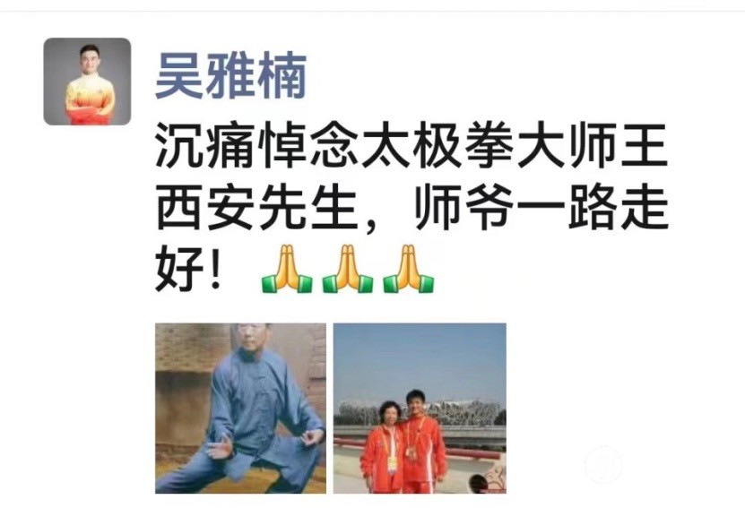 陕西武术网讯(武双安):著名武术家、国家首批非物质文化遗产(陈氏太极拳项目代表性)传承人、陈家沟太极拳“四大金刚”之一、陈式太极拳第十一代传人、国家武术高级教练王西安先生,于2024年2月6日逝世,享年81岁。王西安先生一生致力于陈式太极拳的传承与发展,为太极拳在世界范围内的传播与发展做出了巨大贡献。 惊闻陈式太极拳大师王西安仙逝,著名武术家、中国武术九段、陕西武术队太极拳专家徐毓茹老师第一时间发文悼念恩师王西安先生。与此同时,太极名将、高级教练吴雅楠也在朋友圈发文悼念,陕西武术队太极拳组教练宁彪带领诸位教练和队员深切追思缅怀一代宗师王西安先生。 本站责编:小七 |