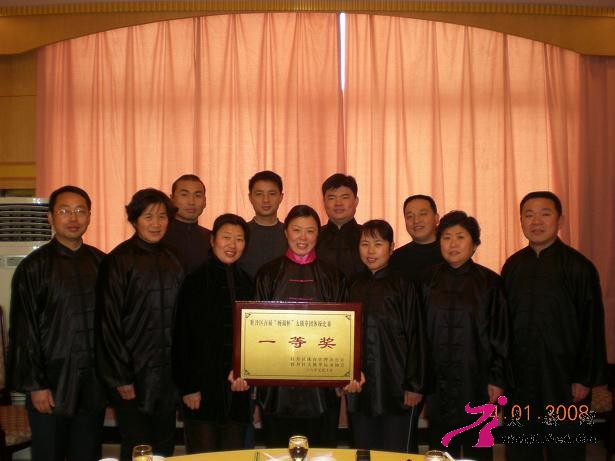 2008年1月10日,在菏泽市牡丹区太极拳协会举办的牡丹区首届“杨湖杯”太极拳团体操比赛中,中国槐园益友拳社的太极精英们怀着对太极拳的热爱,努力拼搏,沉着应战,取得了比赛第一名的好成绩。目前,菏泽共有大小太极拳辅导站38个,习拳者近万人,这次参赛的有20个代表队的28个比赛节目。在这次比赛中,益友拳社的拳友们一套陈式太极拳,伴着一曲《步步清风》,步法沉稳,动作轻灵,弹跳自如,刚柔相剂,打出了陈式太极拳的风格和润味,取得第一名可谓名副其实。中国槐园益友拳社成立不到两年,拳龄最短的才半年,是一支新生力量,在全区大赛中能脱颖而出,这与平时他们对太极拳的执着和刻苦训练是分不开的,更是倾注了他们的教练杨品红女士的全部心血。衷心的祝愿益友拳社在今后取得更好的成绩。(人生)  |