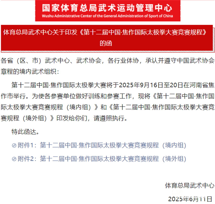 第十二届中国·焦作国际太极拳大赛 竞赛规程(境内组) 一、竞赛日期和地点 2025年9月16日至20日在河南省焦作市举行。 二、主办单位 国家体育总局武术运动管理中心、中国武术协会、河南省体育局、焦作市人民政府。 三、承办单位 河南省武术体操冰雪运动中心、河南省武术协会、焦作市体育局、温县人民政府。 四、协办单位 焦作市体育场馆中心、焦作市武术协会。 五、参加单位 各省、自治区、直辖市、计划单列市、新疆生产建设兵团体育局武术运动管理中心(武术主管部门)、武术协会,各行业体协,各体育院校,各武术之乡;承认并遵守中国武术协会章程的境内武术组织。 六、竞赛项目 (一)个人项目: 1.规定项目:陈式、杨式、吴式、武式、孙式太极拳竞赛套路。24式太极拳、42式太极拳、42式太极剑、32式太极剑。 2.传统项目:陈式太极拳(械)、杨式太极拳(械)、吴式太极拳(械)、武式太极拳(械)、孙式太极拳(械)、和式太极拳(械)、其它太极拳(械)。 (二)集体项目: 集体太极(八法五步)、集体太极拳、集体太极器械、集体太极拳械。 (三)太极拳推手项目: 竞赛级别: (1)48公斤级(≤48Kg) (2)52公斤级(>48Kg-≤52Kg) (3)56公斤级(>52Kg-≤56Kg) (4)60公斤级(>56Kg-≤60Kg) (5)65公斤级(>60Kg-≤65Kg) (6)70公斤级(>65Kg-≤70Kg) (7)75公斤级(>70Kg-≤75Kg) (8)80公斤级(>75Kg-≤80Kg) (9)80公斤级以上级(>80Kg) 七、参加办法 (一)每单位最多报3支队伍,每支队伍可报领队、教练、随队医生各1人,运动员不超过20人(男、女不限)。 (二)个人项目:每名运动员限报1项拳术、1项器械。可兼报集体项目。 (三)集体项目:每队限报集体项目1项,人数不得少于6人,男、女可混合编组,不设年龄组别。人数少于6人不予编排。 (四)太极拳推手项目: 1.每队每级别男、女分别限报1人。 2.报名参加太极拳推手比赛运动员必须有太极拳习练经历,并具备武术(太极拳)四段及以上段位,或武术套路(太极拳)二级运动员技术等级,或近2年内参加省级及以上武术 套路比赛,获得太极拳个人项目成绩达8.5分以上,且能熟练运用太极拳推手技术方法者,方可报名。 八、竞赛办法 (一)比赛执行中国武术协会审定的《传统武术套路竞赛规则(2024)》及相关补充规定。 (二)太极拳推手项目执行《武术太极拳推手竞赛规则(2024试行版)》。上述规则可在中国武术协会官方网站(www.wushu.com.cn)下载。 (三)完成套路时间: 1.太极拳项目3~4分钟。演练至3分钟时,裁判长鸣哨提示。 2.太极器械项目2~3分钟。演练至2分钟时,裁判长鸣哨提示。 3.集体项目4~6分钟。 4.太极拳推手比赛:每场比赛为两局,每局净推2分钟,局间无休息。 (四)规定项目必须按照规定套路顺序演练,不得增减和改变动作。每增减一个动作或每改变动作一次,均扣0.1分,累计扣分。裁判长吹哨之后的剩余套路未完成不予扣分。 (五)集体项目须配音乐(自备音乐,MP3格式)。音乐中不得出现说唱等内容,出现说唱者,由裁判长总扣0.1分;未配乐者,由裁判长总扣0.1分。比赛时,由本队教练或领队负责播放音乐。 (六)年龄分组: 1.个人项目年龄分组: A组:11岁和11岁以下(2014年1月1日之后出生)。 B组:12岁至17岁(2008年1月1日至2013年12月31日)。 C组:18岁至39岁(1986年1月1日至2007年12月31日)。 D组:40岁至59岁(1966年1月1日至1985年12月31日)。 E组:60岁和60岁以上(1965年12月31日之前出生)。 2.太极拳推手年龄分组: 参赛运动员年龄限在19至45周岁(1980年1月1日至2006年12月31日)。 九、录取与奖励办法 (一)个人项目:各单项各组别男、女分别设一等奖30%、二等奖30%、三等奖30%。颁发获奖证书和奖牌,其它颁发参赛证书。录取比例均按照实际参赛人数,采取四舍五入的办法。 (二)集体项目:不设年龄组别,太极拳、太极器械、太极拳械分别设一等奖30%、二等奖30%、三等奖40%颁发获奖牌匾,个人颁发获奖证书。 (三)太极拳推手:各级别男、女分别设前8名。各级别在9人以下时,减一录取。1至2人时,不设名次。第一、二、三名颁发金、银、铜奖牌和证书,第四至八名颁发证书。 (四)凡未获得名次和奖项的运动员,组委会颁发参赛纪念证书。 (五)各单项各年龄组别男、女报名人数在5人(含5人)以下时,按同类项目相近年龄组别合并,男、女分别录取。 (六)单个项目参赛人数超过60人时,将通过抽签进行分组比赛与录取。 (七)设中国焦作国际太极拳大赛“太极精英”奖。 1.按太极拳、太极器械,分男、女组共录取“太极精英”总计4名选手(境内组)。参加“太极精英”比赛者须是各单项(以实际参赛人数在20人及20人以上的项目)第一名的运动员。颁发证书和奖金10000元人民币。 2.获得个人项目第一名的运动员,如需参加“太极精英”大奖赛,请在个人项目比赛结束后,马上到编排记录组报名。如拳、械两项均获第一名,则须现场选定一项参赛,另一项由第二名递补参赛。 (八)设中国焦作国际太极拳大赛“太极拳推手之星”奖。给予各组别实际参赛人数在8人以上(含8人)的第一名运动员,颁发证书和奖金1000元人民币。 (九)本次比赛设“武德风尚奖”运动员、裁判员。主要依据参赛队员的数量,参赛项目的数量,比赛成绩、参赛礼仪以及赛风、赛纪等方面进行评选。 (十)本届比赛专场(境内组)个人成绩可作为认定武术段位1-6段技术免试依据。凡比赛成绩和资格达到晋升相应段位的参赛者,由本人提出申请,向所在地段位制办公室进行申报或通过
