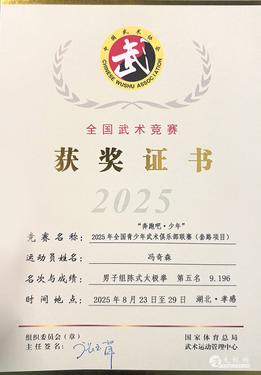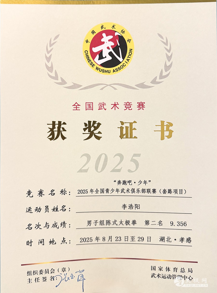 |   2025年8月23日至29日,由国家体育总局武术运动管理中心、中国武术协会举办的 “奔跑吧·少年”2025年全国青少年武术俱乐部联赛(套路项目)在湖北省孝感市火热举行。本次赛事规模宏大,吸引了来自全国各省、自治区、直辖市327个参赛队伍的2490人报名参赛,共同展现中华武术的独特魅力。   在备受关注的陈式太极拳比赛中,由温县陈正雷太极拳馆馆长党绍静和总教练陈淇带领的参赛队伍表现突出。该馆选送的少年选手李浩阳以9.356分的优异成绩荣获全国第二名,冯奇森以9.196分取得全国第五名。凭借此次出色表现,李浩阳成功获得"国家一级运动员"称号,冯奇森荣获"国家二级运动员"称号。   温县陈正雷太极拳馆自2009年成立以来,在党绍静等教练团队的努力下,培养出了大批优秀学员。党绍静作为陈氏太极拳第十三代传人、河南省一级拳师,不仅自身武艺精湛,还长期致力于太极拳教学与推广工作。此次学员在全国大赛中取得优异成绩,正是该馆教学成果的有力见证。   据悉,该项赛事是我国青少年武术俱乐部最高水平的联赛之一,旨在促进青少年武术运动的普及与发展,发现和培养优秀武术后备人才。期待未来有更多像李浩阳和冯奇森这样的优秀选手在武术赛场上绽放光芒,传承和弘扬中华武术精神。 责编:小田 |