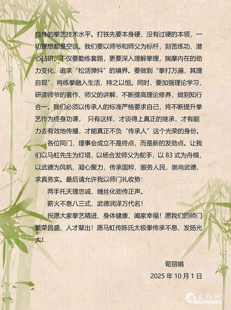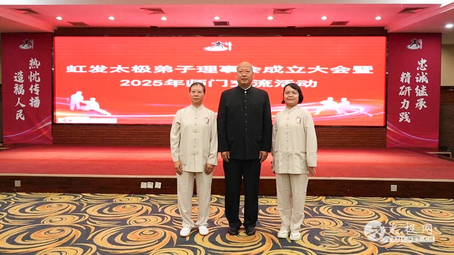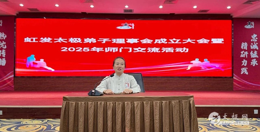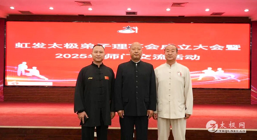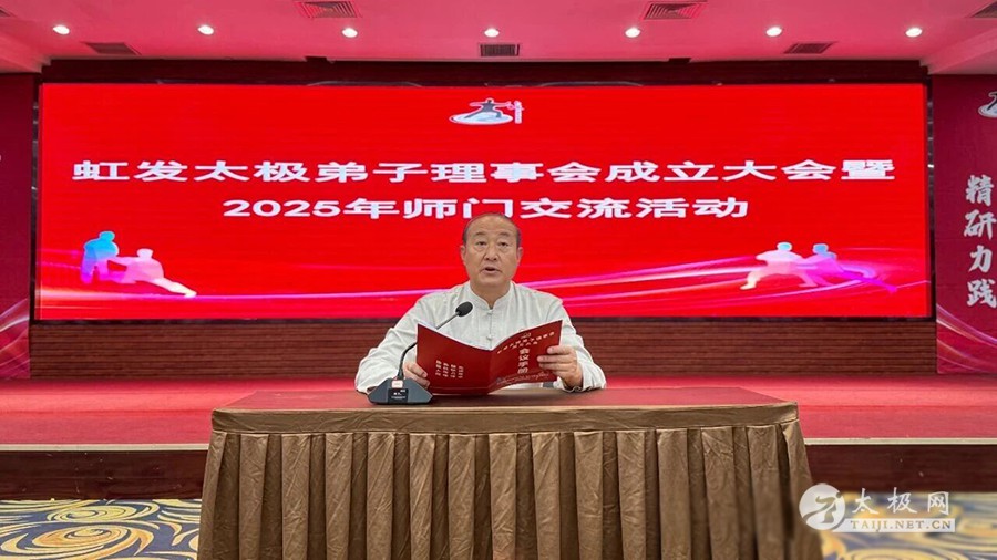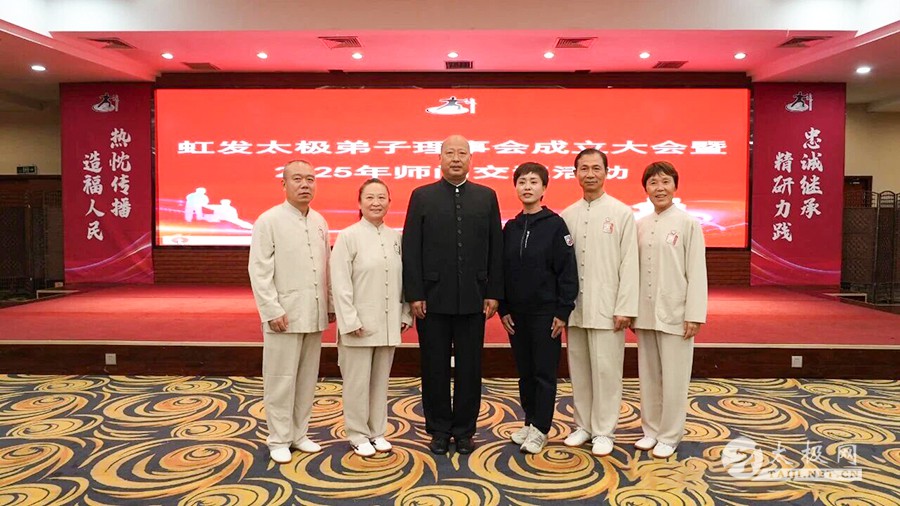 《水调歌头·虹发太极师门交流》 曙照拳旗动, 少长聚石门。 虹发同脉, 百侣白衣接晴暾。 刀起秋风落月, 剑啸清霜飞电, 拳影写乾坤。 师语千钧重, 弟子共铭恩。 童步稳,壮势阔,老姿尊。 同台一笑,万国和气此中生。 且把国粹远播, 任他岁月更迭, 薪火自长存。 来日再相会, 拳意满乾坤。 10月1日下午,虹发太极拳弟子理事会成立大会后,2025年虹发太极师门交流活动在石家庄阳光格瑞酒店举行。百余名虹发弟子以拳会师,以心立规。 杨合发先生展示陈氏太极拳