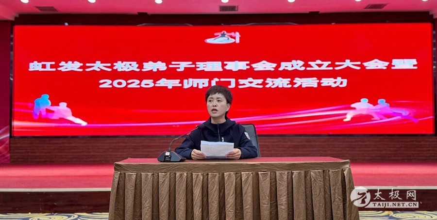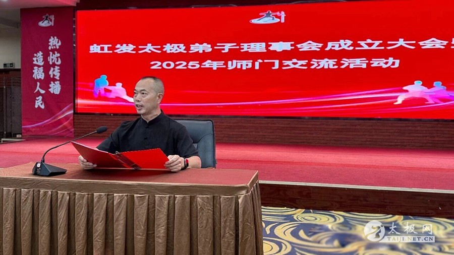 主持人张鹏 虹发太极弟子理事会会长张和平首先解读《理事会章程》《行为规范》等理事会文件,明确“制度为纲、德术双修”的师门新路。随后,龙海、颜红、荀丽娟、赵兴皓四位弟子代表依次发言,分享习拳感悟,展望传承愿景。 杨合发先生登台寄语:“理事会不是招牌,是责任;弟子不是名分,是种子。愿大家守正创新,让马虹精神在新时代枝繁叶茂。”言毕全场掌声经久不息。 展演环节,十五组轮番登台:春秋大刀呼啸劈风,太极双刀旋成银瀑;十三岁最小弟子王子涵拳架松沉如松,掌声瞬间点燃,随后被同门师兄弟高呼“再来一段”,又即兴亮出陈氏太极单刀,刀光映稚气,萌勇双全。 杨合发先生压轴出场(视频见开篇处),陈氏太极拳与陈氏太极剑即兴连演,拳走游龙,剑绽飞凤,全场屏息凝神,继而爆发出雷鸣般欢呼,敬仰之情在拳风剑影中升腾到极致。