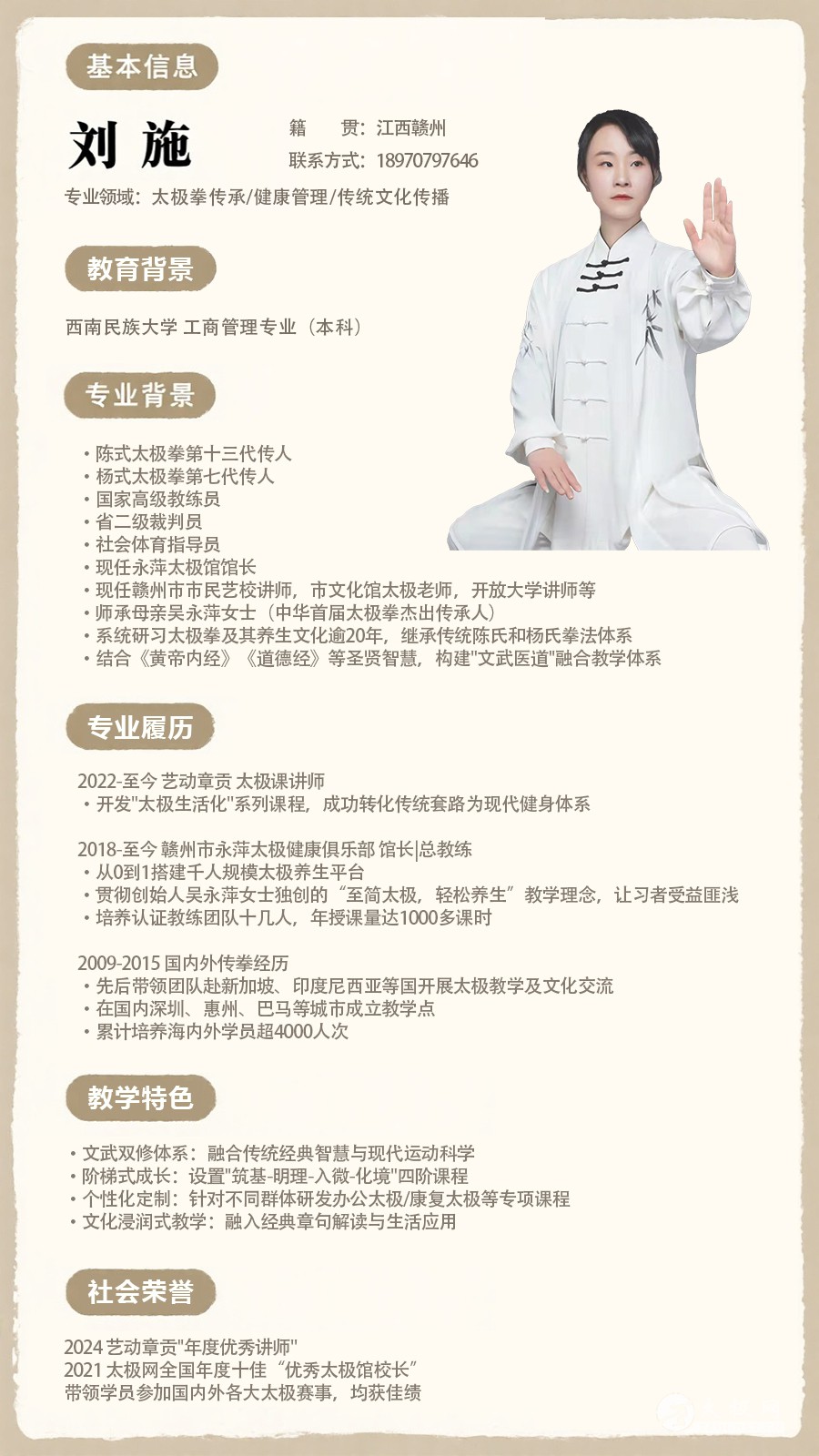 在江西赣州一间宽敞明亮的太极养生馆内,刘施正带领学员练习太极拳。每一个动作的起承转合间,既可见传统太极的沉稳圆融,又能感受到一位商业管理者的清晰思路。这位1985年出生的太极传人,正在用自己的方式重新定义太极拳在当代社会的存在形式。 家学渊源 刘施的太极之路始于家庭。自幼跟随母亲吴永萍女士——中华首届太极拳杰出传承人——学习太极拳,逾今已有二十年。她不仅是陈氏太极拳第十三代传人,也是杨氏太极拳第七代传人,深得母亲真传。 “母亲教我的不仅是招式,更是太极拳背后的哲学和文化。”刘施回忆道。这种深厚的家学背景,让她对太极的理解从一开始就超越了单纯的肢体运动,深入到文化内核。 工商管理本科的教育背景和五年商业连锁管理岗位的从业经历,为刘施提供了独特的视角。她看到了太极拳在当代社会传播的瓶颈,也看到了其产业化发展的可能性。2018年,她创办“永萍太极养生馆”,担任馆长兼总教练,开始了太极传承与产业探索的双重旅程。 教学创新 走进永萍太极养生馆,你会发现这里的教学与众不同。刘施强调“拳理拳法”,让学员不仅学会动作,更要理解每一个招式背后的养生原理。 “我们结合《黄帝内经》《道德经》等中华传统文化精髓,总结出独特的教学体系。”刘施介绍道。这种深入浅出的教学方式,让学员能够“轻松快速地步入太极殿堂,感悟天人合一之道”。 多年来,拳馆已教授学生千余名,组织公益讲座数十场。更令人称道的是,学员中出现了许多疗愈案例:失眠问题解决、富贵包消除、甲状腺问题康复、颈椎腰椎及膝关节好转、肺部结节消失、三高糖尿病指标正常化...这些实实在在的效果,成为太极养生价值的最佳证明。 以商业思维破局太极产业化 刘施的商业管理背景在这里发挥了关键作用。她在拳馆运营中总结经验,建立管理规范,打造人才梯队,制定教练员培养及激励机制,为拳馆未来的连锁发展提供可复制的样本。 “太极拳要想在现代社会获得更大发展,必须探索产业化路径。”刘施坦言。她创办“永萍太极”,正是要“探索太极产业化发展的运营模式,打造太极拳商业连锁的人才储备基地”。 为此,她积极开展多元化的太极活动:组织太极文化之旅、举办文艺晚会、与与各地康养、文旅机构达成战略合作...这些举措不仅丰富了学员的学拳生活,增强了团队凝聚力,更在深层次上挖掘太极文化内核,结合合作方资源优势,打造文化康养产业基地。 跨地域传播:让太极生根发芽 刘施的太极版图不局限于赣州。她在广东省惠州市春耕园学校开设太极课,将太极文化引入校园;在深圳莲花山公园设立太极培训站,让都市人在自然中体验太极;在广西巴马中脉秘境合作成立永萍太极研习康养基地,探索太极与康养旅游的结合;在赣州当地政府举办的文化惠民工程中担任太极“特聘讲师”,推动太极普及。 互联网+太极的创新实践 面对数字化浪潮,刘施积极拥抱变化,利用互联网开展形式多样的文化传播及教学活动。她开展直播讲座,与知名国学平台互动,开发线上课程...这些创新举措,让太极文化突破了时空限制,触达更广泛的人群。 “太极拳是国粹,但在新时代需要有新的传播方式。”刘施说。她的线上课程不仅教授太极招式,更融入传统文化讲解,让学员在练拳的同时,领略中华文化的深厚底蕴。 未来愿景 展望未来,刘施有更宏大的规划。她希望将“永萍太极”打造成一个集教学、康养、文化传播、产业研究于一体的太极文化生态系统。这个系统不仅包括实体养生馆和培训基地,还包括线上教学平台、太极文化研究中心、太极产品开发等多个维度。 “太极拳不仅仅是一种武术或健身方式,它蕴含着中华文化的核心智慧。”刘施认为,“在快节奏的现代生活中,太极提供了一种平衡身心、连接传统与当代的生活方式。” 在刘施身上,我们看到了一位传统文化传承者的坚守,也看到了一位现代创业者的创新精神。她将家学传承与商业管理相结合,将文化传播与产业发展相融合,为太极拳在当代社会的发展开辟了一条新路径。这条路上,既有对传统文化的敬畏与传承,也有对时代需求的敏锐回应。 太极档案: 刘施,江西赣州人,工商管理本科,五年商业连锁管理岗位从业经历。陈氏太极拳第十三代传人,杨氏太极拳第七代传人。自幼跟随母亲吴永萍女(中华首届太极拳杰出传承人)学习太极拳,逾今二十年,深得母亲真传,同时刻苦钻研,理论实际相结合,教学相长。现任赣州市永萍太极养生馆馆长兼总教练。 荣誉经历: 2019年带队参加“豫见太极”首届云台山太极拳交流大赛,团队荣获多项个人项目一等奖、二等奖、三等奖,团队获集体项目三等奖; 2020年带队参加首届“乐道”太极精英网络大赛,团队荣获个人项目一等奖9名、二等奖6名、三等奖6名; 2020年带队参加“红棉杯”第六届太极拳网络视频大赛,团队荣获个人项目一等奖12名、二等奖11名、最佳人气奖2名; 2021年带队参加第二届三亚太极拳网络大赛,团队荣获个人项目一等奖25名、二等奖10名、团体获集体项目一等奖; 2021年“拳论酒”第七届太极拳网络视频大赛,获青年组杨式太极拳一等奖、青年组陈式太极拳二等奖; 2021年,荣获太极网“十大优秀太极馆校长”称号; 2022年“拳论杯”第八届太极拳网络视频大赛,荣获青年组陈式太极拳一等奖、青