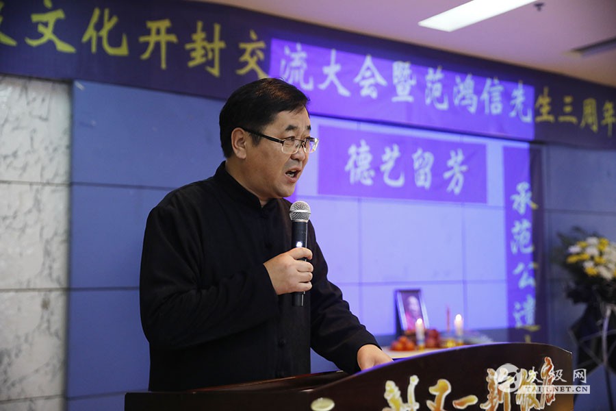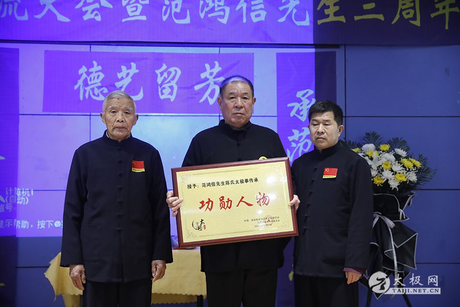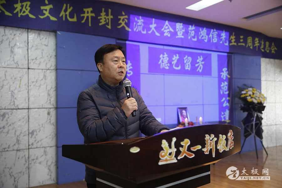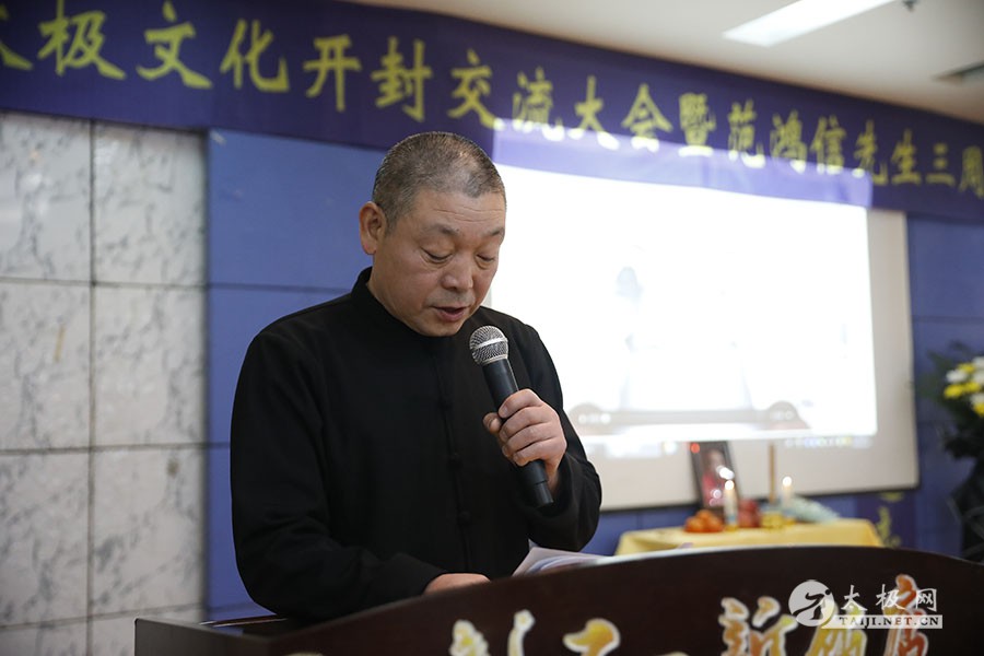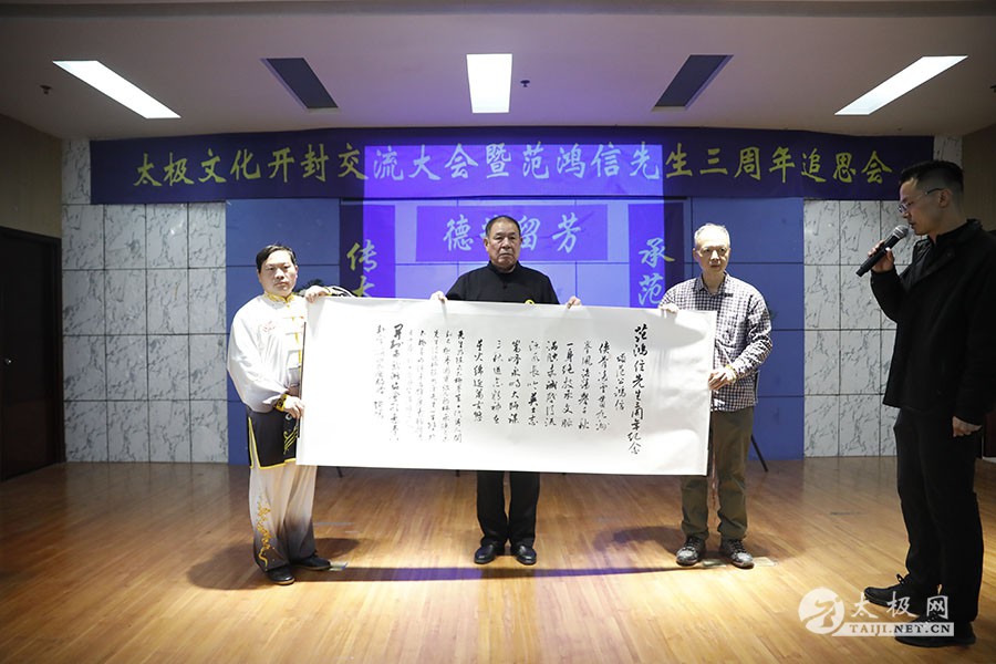 汴梁追思 太极传薪 太极文化开封交流大会暨范鸿信先生三周年追思会举行 (太极网讯)斯人已逝,风范永存。岁序更替,哀思绵长。2025年12月27日,一代太极拳大家范鸿信逝世三周年之际,来自全国各地的武术界嘉宾、太极拳名家、传承人以及范鸿信先生的家属、弟子传人们齐聚古都开封,以太极的名义缅怀先贤、交流分享、共话传承,共同参与太极文化开封交流大会暨范鸿信先生追思会,让跨越时空的思念与薪火相传的使命在八朝古都交融共鸣。 开封市武术协会主席吕玉中,温县政协副主席严双军,温县太极拳武术文化发展中心党组书记任海林,《少林与太极》杂志社原总编、河南广电武术世界频道首席顾问赵国华,原温县体育局局长原福全,西安市武术协会常务副主席、陈金鳌太极拳学会会长刘永强,西安陈金鳌太极拳学会执行会长张勇刚,一代太极宗师陈克忠公之孙、温县陈伯祥拳术研究会副会长陈天祥,温县陈家沟历史文化研究会原会长陈一华、新任会长陈长江,温县陈家沟陈氏太极拳小架研究会会长陈瑞华,陈氏太极拳省级代表性传承人陈冲,陈家沟陈氏太极拳小架研究会副会长陈天森、秘书长陈天庆,太极拳市级代表性传承人张世庆,“陈沟水”网络平台负责人李鹏,河南广电武术世界频道特约撰稿人徐贺鹏等嘉宾出席活动。 开封武协副主席、太极拳专工委副主任马德云、李建设,开封武协副主席铁卫平、市属体育社会组织第一党支部书记王文超、大相国寺保卫处长马培庆,开封武协荣誉主席、少林太祖拳研究会会长朱文卿、苌家拳研究会会长雷中山、形意拳八卦掌研究会会长郭国成,开封武协执行秘书长、办公室主任杨如意、安保部主任种明生、外宣部主任郭海成,开封武协名誉主席、太极拳专工委总召集人兼办公室主任王宝真、太极拳专工委执行秘书长、陈瑜家传功夫架开封研究会会长赵泉,开封市太极拳专工委副秘书长、陈鑫拳法开封研究会会长申为民,开封市田家炳高级中学武术高级教练朱誉等开封武协领导班子及各武术研究会负责人到场参会。 多年来,太极网与范鸿信先生及其弟子传人建立了深厚的太极友谊和密切的交流,有幸见证了范鸿信先生太极人生的高光时刻和荣耀成就,尤其是2009年先生作为太极网大型太极人物专题片《东南西北太极人》首位入选人物,2016年太极网第二届国际太极拳网络视频大赛颁奖盛典上授予先生《太极拳终身成就奖》······本次活动,太极网创始人、温县太极拳传承人联合会主席刘洪奇先生特别精心设计制作了范鸿信老师的太极人生纪念相册,用影像定格时光,以相册承载追思。太极网总编李超主持了本次追思会。 李超主持活动 追思会现场氛围庄重而温情,有序进行。范鸿信先生之子范新林代表上香祭奠,以传统礼仪寄托对范老的深切缅怀;全体嘉宾肃立,三分钟默哀时刻,全场静谧,思念之情萦绕心间。出席活动的嘉宾分别登台致辞,深情表达对范鸿信先生的缅怀与敬意,同时分享对太极文化传承的实践与思考。 开封范鸿信陈式太极拳学会代表刘国富宣读祭文,字字深情,追忆先生生平;句句恳切,承载传承决心。 作为先生遗志的继承者,范鸿信先生之子、开封范鸿信陈式太极拳学会会长范新林在致辞中深情分享了对父亲的思念与接续推广陈式太极拳的坚定愿景。 家属代表、范鸿信先生孙女范娟女士则通过点滴往事,讲述了先生作为长辈的温暖与作为武者的坚守,让现场观众更深刻地感受到范老的人格魅力。 温县陈家沟历史文化研究会原会长陈一华、新任会长陈长江向范鸿信先生家属颁发证书。陈长江分享了范鸿信先生与温县陈家沟的深厚渊源,希望开封与陈家沟的太极情谊源远流长。 一代宗师陈克忠公之嫡孙、温县陈伯祥拳术研究会副会长陈天祥在致辞中谈及先生曾师从陈克忠宗师深耕太极小架,他表示这份师门情谊定会跨越时空代代相传。 温县政协副主席严双军回顾总结了范鸿信先生的太极拳事业和成就,并给与高度评价。对太极拳传承发展表达了期许,他表示,在范鸿信先生等先辈的精神引领和照耀下,太极拳必将在新时代焕发出更强大的生命力。 《少林与太极》杂志社原总编、河南广播电视台武术世界频道首席顾问赵国华从大武术、大太极的角度进行了分享,他表示太极拳不仅是一套拳法,更是中华优秀传统文化的鲜活载体,愿与各位同仁一道,尽己所能推动太极拳的推广与普及。 太极网创始人刘洪奇在大会上致辞中深情回顾了与范鸿信先生的深厚交往,高度赞誉先生的太极技艺和儒雅风范,如清风细雨、润物无声,为弟子传人及后学留下了星光熠熠的太极精神,树立了太极拳传承的典范和丰碑。 西安陈金鳌太极拳学会执行会长张勇刚回顾了范鸿信与其师父李树发两位太极大家的深厚情谊,作为同门后学,他深受范老影响和激励。他表示从开封到西安,太极文化早已成为连接各地同仁的精神纽带。 温县陈家沟陈氏太极拳小架研究会会长陈瑞华则分享了陈式太极拳小架的传承与发展的思考,称范鸿信先生是他们永远不能忘怀的榜样。 西安市武术协会常务副主席、陈金鳌太极拳学会会长刘永强赞誉范鸿信先生的太极魅力是温润如玉,让人如沐春风。要传承先生的太极技艺,更要弘扬先生的太极精神。希望太极同道们要相互交融、共同发展,为中华文化的繁荣贡献更多力量。 作为活