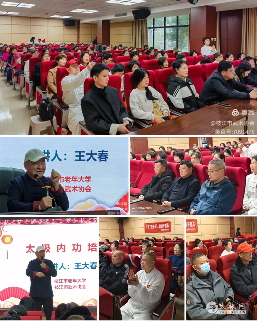 为弘扬中华传统太极文化,普及科学健康养生理念,近日,枝江市老年大学武术班特邀著名太极内功及内功指针疗法名家、陈家沟太极拳宣传顾问、峨眉山大春太极山庄董事长王大春先生开展太极内功专题授课。 活动以“大健康”为导向,紧扣“内外双修、大道至简”的核心理念,为学员们带来一堂兼具理论深度与实践价值的养生功法课,助力老年群体通过传统功法实现身心和谐与健康提升。 系统阐释功理,沉浸式体验太极精髓 授课中,王大春老师从太极内功的文化渊源与哲学内涵切入,结合现代科学视角,系统阐释其“天人合一、阴阳平衡”的基本原理与独特养生价值。他以站桩功法为核心,通过“分解动作示范+呼吸节奏引导”的方式,逐一讲解“虚领顶劲、沉肩坠肘、松腰敛臀”等关键要领,并亲自纠正学员姿势,确保动作规范。 内外双修,揭秘站桩养生奥秘 现场互动环节,王老师以手掌轻拂学员身体,引导其感知“气感流动”,不少学员反馈“四肢微麻、经络通畅”,直呼“功法神奇”。 王大春老师强调,太极内功的核心在于“内外兼修”:站桩作为基础功法,外可强筋骨、稳固身形,通过腿部持续发力锻炼肌肉耐力;内可调气血、通经络,在入静状态下借助呼吸导引实现脏腑按摩,促进内气运行。他以“春风拂柳”比喻站桩的松柔状态,指出“松而不懈、紧而不僵”方能达到“形神合一”的至高境界。学员们跟随指导反复练习,逐渐掌握“以意领气、以气运身”的修习方法,现场氛围热烈而专注。 学员反响热烈,养生智慧深入人心 课堂上,学员们全神贯注记录要点,积极提问交流。一位年过六旬的学员表示:“过去站桩总找不到感觉,今天王老师一指导,立刻体会到‘气沉丹田’的妙处!”另一位学员感慨:“太极不仅是武术,更是修身养性的哲学,今后要坚持练习,让身心更健康。” 枝江市老年大学辛武校长在总结中指出,此次专题授课“既传承了文化精髓,又契合了老年群体健康需求”,未来将持续引入优质资源,丰富武术班课程体系。 此次活动由枝江市武术协会主办,枝江市老年大学协办,通过名师授课、实践体验与互动交流,太极养生智慧真正走进老年群体,为学员们搭建了学习交流、健康养生的优质平台。 未来,枝江市老年大学武术班将继续以“传承国粹、服务健康”为宗旨,助力老年朋友在传统功法中强健体魄、涵养心性,实现“老有所学、老有所乐、老有所康”的美好愿景。 在此,衷心感谢辛勤拍摄的摄影师们,用镜头定格美好;感谢认真负责的登记工作人员,默默坚守、细致服务;感谢各位会员积极参与、全力支持。更要特别感恩那些不求名利、默默无闻、慷慨相助的赞助者们,正是你们的无私奉献与鼎力支持,为本次活动筑牢坚实后盾,让活动得以圆满顺利、圆满成功! 图文来源:枝江市武术协会 本站责编:宋丽丹 |