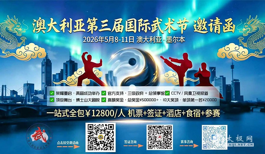 以武会友,以技传情;跨越山海,共耀武魂。 备受全球武术爱好者瞩目的澳洲第三届国际武术节,正携着满腔热忱与权威底蕴,向世界发出邀约。这里不仅有高标准的竞技赛场、多元化的武术展演,更汇聚了戈春艳、傅清泉、张茂清,徐勤兰四位武术界泰斗级大咖,他们将亲临现场,带来粉丝拳友见面会与为期一周的专属武术传授小班。这场难得一遇的武林盛会,正让东方武术惊艳南半球! 权威媒体双重加持:千万级粉丝矩阵平台、创立于1997年的全球首家太极拳门户网站创始人刘洪奇亲自主持,中国武术权威泰斗领衔亲临,市洲联邦三级政府加持、海内外主流媒体全程聚焦报道,共襄这场史无前例,万众瞩目的武林巅峰盛事! 本次武术节严格遵循国际赛事规范,涵盖单练、太极拳、对练、集体项目等多个类别,设置巨额超级大奖,更有明星大咖市长嘉宾亲自颁奖、中外主流媒体全程报道的重磅福利。特别难得的是,四位名家将同步开启粉丝拳友见面会,更开设为期一周的武术传授小班,一对一、手把手传授独门技艺,这份近距离接触武术泰斗、深耕武术精髓的机会,堪称全球武术爱好者的终极福利! 名家风采|一身武艺,一生坚守,皆是武魂传承人 每位名家,都是中华武术的鲜活载体,更是非遗武学的传承脊梁;每一套招式,都藏着千年武术的深厚底蕴,每一次传授,都承载着武魂延续的使命。接下来,就让我们一同走进这三位武术泰斗的世界,感受他们的传奇风采,解锁这场难得一遇的武术盛宴! 戈春艳——八卦掌宗师,李连杰同门师姐 在中华武术界,葛春燕是当之无愧的巾帼泰斗,她曾在《杨门女将》等经典影视作品中,塑造过众多英姿飒爽、深入人心的巾帼角色,以扎实的武术功底与出色的表演,成为一代人心中的功夫记忆。 「武英级」运动员、中国武术七段的荣誉加持,让她成为无数武术爱好者心中的标杆。身为第一批北京武术队运动员,她与功夫巨星李连杰同门,更曾担任北京武术队教练、女队队长,以过硬实力撑起武林巾帼半边天,是名副其实的“武林女杰”。 她身兼八卦掌第五代门人、陈式太极拳第十九代传人、混元太极拳第二代传人三重身份,技艺全面且登峰造极。 1984年全国武术比赛中,她一战封神,一人独揽个人全能、团体、八卦掌等六大赛事五枚金牌,更连续五次斩获全国八卦掌冠军,用实力诠释“术业有专攻”的极致追求。 2004年创办“八方武术训练中心”和“中国国际八卦掌学院”,吸引海内外无数学员慕名而来,更曾担任《武林志》女主角、《一代宗师》八卦掌指导,让中华武术的刚柔之美透过影视与教学,走向全球。身为深耕海外武术传播的名家,她始终致力于让东方武魂跨越山海,影响世界。 这次赴澳出席武术节,戈春艳不仅将带来精彩的八卦掌、太极拳展演,更将开启专属粉丝拳友见面会,与全球爱好者面对面交流习武心得、合影互动。 同时,她将开设为期一周的武术传授小班,拆解八卦掌、太极拳核心招式,手把手指导发力技巧,无论是入门爱好者还是进阶武者,都能在她的指导下,解锁武学新境界,这样近距离聆听宗师教诲的机会,实属难得! 张茂清——孙氏太极拳传人,中国武术九段(武术最高段位) 在中国武术界,张茂清是举足轻重的泰斗级人物,手握中国武术九段这一武术领域的最高荣誉,更是国家级非遗项目孙氏太极拳第三代传人,用数十年深耕,诠释着非遗武术的传承与坚守。 身为天津市武术协会名誉主席、天津市孙氏拳研究会会长,他不仅是孙氏太极的传承者,也是中华武术文化传播的推动者。 孙氏太极拳由武术宗师孙禄堂创始,历经百年传承,以「高架活步、进退相随、开合相接」为鲜明特点,融合形意、八卦、太极之精华,是中华武术的集大成者。 张茂清自幼研习孙氏太极拳,遍历名师、博采众长,不仅精通孙氏太极拳套路、器械、推手等全套技法,更深谙其文化精髓,行拳走架间,将刚柔并济、动静结合的太极真谛展现得淋漓尽致。 多年来,他常年奔走于海内外授拳讲学,培养了大批孙氏太极拳传人,更多次亮相各类国际武术交流活动,展览孙氏太极风采。 凭借着深厚的武术造诣与卓越的传承贡献,张茂清成为业界公认的孙氏太极拳领导人物,更是海外武术交流的重要桥梁。此次受邀出席澳洲第三届国际武术节,他将带来高水准的孙氏太极拳展演,同时开启粉丝拳友见面会,与全球武术爱好者交流切磋、分享传承心得。更难得的是,他将开设为期一周的武术传授小班,拆解孙氏太极的核心招式与发力精髓,手把手指导学员,让每一位参与者都能近距离感受武术九段的深厚功力,收获专属武术提升。 傅清泉——杨氏太极拳亲族传人,「太极少帅」誉满全球 杨氏太极拳,作为全球练习人数最多的太极流派之一(约有2亿人习练),是中华武术的璀璨瑰宝,历经两百余年传承,以「圆活连贯、刚柔并济」的特点,兼具健身与文化价值。而付清泉,作为世界非物质文化遗产杨氏太极拳亲族传人,更是被誉为“太极少帅”,是杨氏太极拳传承与传播的核心领军人物。 他自幼受祖父傅钟文、父亲傅声远两位太极宗师的严格教诲,深得杨氏太极拳正脉真传,6岁习武,年少时便屡获国内外比赛冠军,精通杨氏太极拳套路、器械、推手等全套技法,行拳走架身法中正、劲路轻灵,将「用意不用力」的太极真谛融入每一个招式。身为世界永年太极拳联盟主席、澳洲傅声远国际太