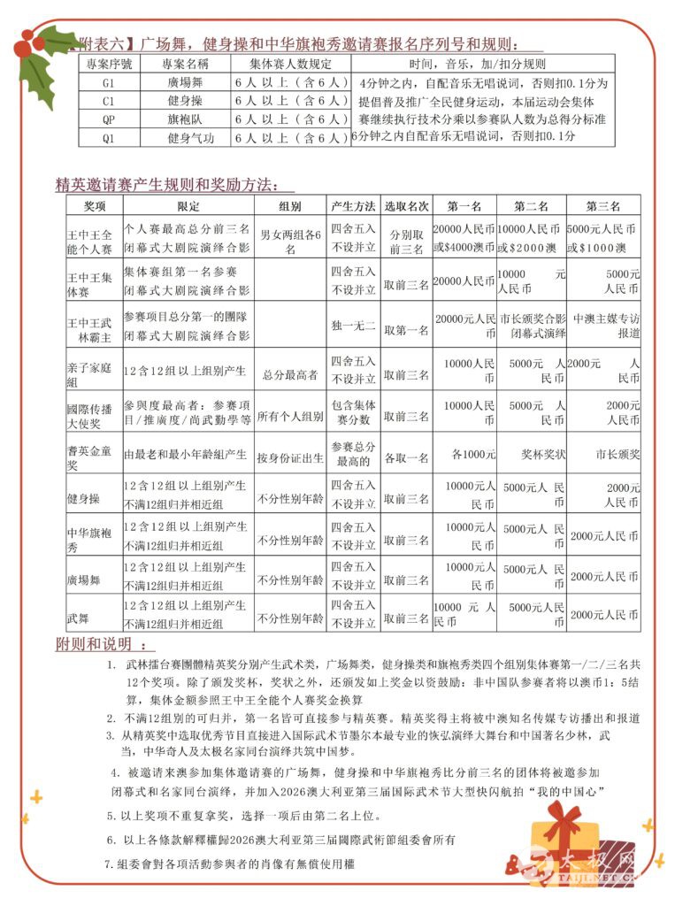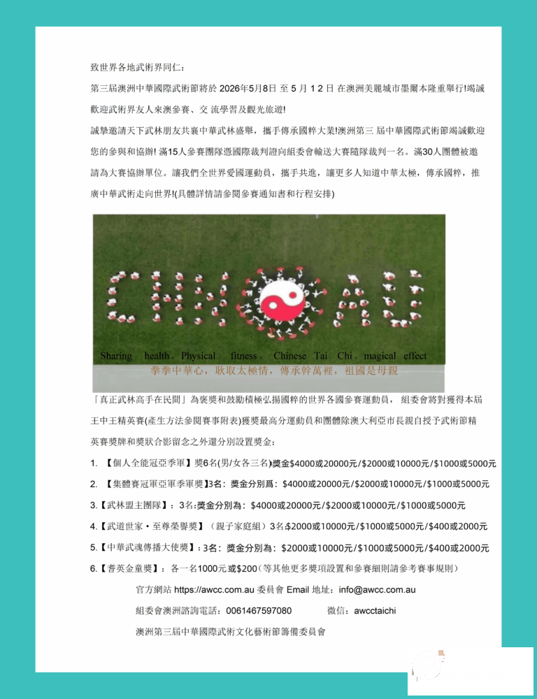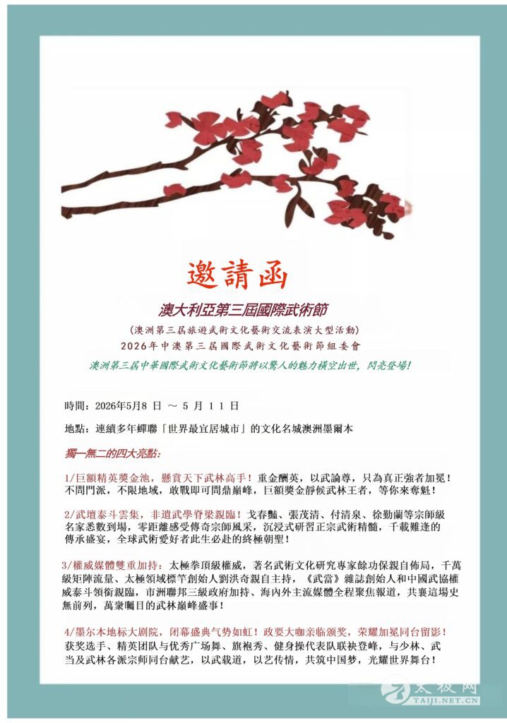 澳大利亚第三届国际武术节邀请函 致世界各地武术界同仁: 台鉴! 第三届澳洲国际武术节将于2026年5月8日至11日在连续多年蝉联「世界最宜居城市」的文化名城:澳洲美丽墨尔本隆重举行,谨此诚挚邀请全球武术界同仁莅临参赛、交流与观光。澳洲国际武术节已于2018年、2019年成功举办两届,因疫情暂停数年後将于2026年荣耀重启。墨尔本诚挚欢迎海内外武术人齐聚这美丽的国土,切磋技艺、共叙武缘。 前两届武术节盛况空前,中国武协第六届主席李杰先生、世界拳太极网总编余功保先生曾亲临澳洲主持武术节及墨尔本论坛,并获得澳洲三级联邦政府及中华人民共和国驻墨尔本总领事馆的高度支持。于博士山公园举行的千人太极空拍活动震撼世界,影响深远。 蒋慧(Wendy)老师:中国武术七段、历届澳洲国际武术节组委会主席,自荣获香港第十六届五项第一的全能冠军后回澳,九年来持续深耕墨尔本公益太极推广,其事迹及两届武术节的盛况,曾获澳洲各级主媒和新华网、人民网、星空卫视,凤凰卫视、央视CCTV四台《华人故事》栏目以整整半个多小时向全世界专题介绍了【澳洲盛开太极花】的纪录片报道。 第三届澳洲国际武术节闭幕式将于墨尔本地标级专业剧院—The Round 博士山大剧院隆重举办,面向世界广邀顶级武术团队登台献艺。赛事将设立高额奖金,并由重量级中澳嘉宾与权威武术名家亲临支持,全方位展现中华武术的时代风采与文化魅力。谨此诚挚邀请天下武林同道,共襄盛举,共谱中华武术走向世界的新篇章。 独一无二的四大亮点: 1、巨额精英奖金池,悬赏天下武林高手!重金酬英,以武论尊,只为真正强者加冕! 不问门派,不限地域,敢战即可问鼎巅峰,巨额奖金静候武林王者,等你来夺魁! 2、武坛泰斗云集,非遗武学脊梁亲临!功夫明星戈春艳、孙式九段张茂清、杨式傅清泉、陈式徐勤兰等宗师级名家悉数到场,零距离感受传奇宗师风采,沉浸式研习正宗武术精髓,千载难逢的传承盛宴,全球武术爱好者此生必赴的终极朝圣! 3、权威媒体双重加持!千万级粉丝矩阵平台、创立于1997年的全球首家太极拳门户网站太极网创始人刘洪奇亲自主持,中国武术权威泰斗领衔亲临,市洲联邦三级政府加持、海内外主流媒体全程聚焦报道,共襄这场史无前列,万众瞩目的武林巅峰盛事。 4、墨尔本地标大剧院,闭幕盛典气势如虹!政要大咖亲临颁奖,荣耀加冕同台留影!获奖选手、精英团队与优秀武道类,国际版舞蹈类和展示类代表队联袂登峰,与少林、武当及武林各派宗师同台献艺,以武载道,以艺传情,共筑中国梦,光耀世界舞台! 致世界各地武术界同仁: 第三届澳洲中华国际武术节将于2026年5月8日至5月11日在澳洲美丽城市墨尔本隆重举行!竭诚欢迎武术界友人来澳参赛、交流学习及观光旅游! 诚挚邀请天下武林朋友共襄中华武林盛举,携手传承国粹大业!澳洲第三届中华国际武术节竭诚欢迎您的参与和协办!满15人参赛团队凭国际裁判证向组委会输送大赛随队裁判一名。满30人团体被邀请为大赛协办单位。 让全世界爱国运动员,携手共进,让更多人知道中华太极,传承国粹,推广中华武术走向世界!(具体详情请参阅参赛通知书和行程安排) 「真正武林高手在民间」为褒奖和鼓励积极弘扬国粹的世界各国参赛运动员,组委会将对获得本届王中王精英赛(产生方法参阅赛事附表)获奖最高分运动员和团体除澳大利亚市长亲自授予武术节精英赛奖牌和奖状合影留念之外,还分别设置奖金: 1.【个人全能冠亚季军】6名(男/女各三名):$4000/$2000/$1000澳币 2.【集体赛冠军亚军季军】3名:$4000/$2000/$1000澳币 3.【武林盟主团队】3名:$4000/$2000/$1000澳币 4.【武道世家·至尊荣誉奖】(亲子家庭组)3名:$2000/$1000/$400澳币 5.【中华武魂传播大使奖】3名:$2000/$1000/$400澳币 6.【耆英金童奖】各一名:$200澳币(具体评奖方法和其他更多奖项设置和参赛细则请查看赛事规则) 官方网站:https://awcc.com.au 委员会 Email 地址:info@awcc.com.au 组委会澳洲咨询电话:0061467597080 微信:awcctaichi / 澳洲第三届中华国际武术文化艺术节筹备委员会 墨尔本·澳洲 文章来源:澳大利亚东武太极联盟网站 |