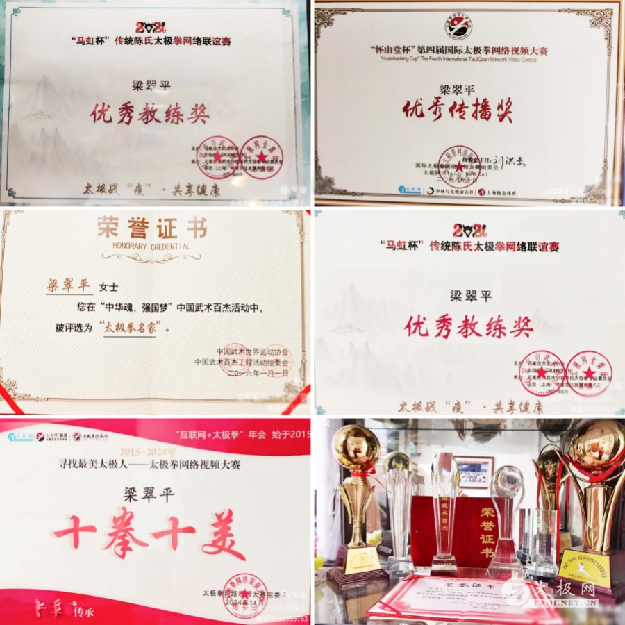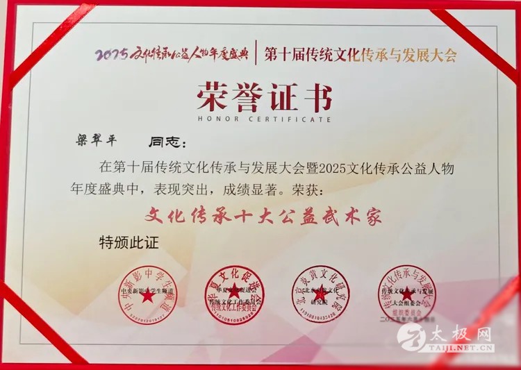 一、梁翠平简介 梁翠平,生于1958年,陈氏太极拳第十二代传人,师承国际太极拳大师马虹先生。习拳至今已三十余载,国家级社会体育指导员,中国武术七段称号,国家二级裁判员,陈式太极拳中级评审师,中国武术百杰太极拳名家。马虹直系冬季练拳挑战九九活动考评专家,太极拳网络视频大赛专家评审。曾荣获太极网传播盛典年度表彰活动十大“年度杰出传播奖”、十大“太极拳风云人物”等荣誉。 在纪念抗日战争胜利80周年主题展博活动中,她获评为全国80名“双创”标杆人物之一。2025年9月8日,她被中央新影中学生频道“文化影响力”栏目特聘为武术顾问,并作为“榜样的力量”受邀嘉宾,出席中央新影《国潮先锋盛典》,在舞台上展示了承载着千年中国传统文化精髓的太极拳。 二、奇石馆辅导站的诞生 梁翠平年轻时响应党的号召,曾插队下乡。她常年在稻田里插秧、干农活,当时农场卫生条件差,她因此患上了严重的风湿、类风湿性骨关节疼痛,还有腰椎间盘突出、颈椎增生压迫神经等问题,更患有严重的风湿性心脏病,二尖瓣、三尖瓣关闭不全导致血液回流量大,心脏间歇严重,身上常年离不开速效救心丸。 她记得,1990年3月24日一个周六的早晨,大约八点多,她去公园遛弯,看到许多老人在慢悠悠地打太极拳。出于好奇,她便跟在后面比划起来。跟练一段时间后,她感觉身体状态有所改善,于是开始正式学习太极拳。一年后,她周身的疾病大有起色,这让她深切体会到太极拳健身祛病的神奇功效,也下定决心要深入追求太极拳。 1992年1月,梁翠平向西城区体育局武术委员会提出申请,组建了北京市西城区奇石馆太极拳辅导站,从此与太极拳结下了不解之缘。 三、公益付出,美好回忆 太极拳是中国传统文化的典型代表,是传统哲学思想的精华,也是中华民族武术宝库中的一朵奇葩。党和国家领导人为了将太极拳推向世界舞台,经常在国内外组织大型太极拳比赛和展示活动。邓小平同志也曾题词“太极拳好”。梁翠平积极响应党的号召,热情参与北京市武协、西城区武协组织的太极拳、太极扇等健身项目展示活动,例如多次参加天安门广场万人太极拳、太极扇表演,并带领团队参加“中华世纪坛”、“天坛”等地的太极拳、太极扇展示。每次活动都让她和团队倍感振奋,收获满满。 为了不断提升自己和团队的技术水平,更好地推广健康生活,她坚持边学、边练、边推广,几十年如一日地忠诚继承、精研力荐、热情传播。她的付出造福了社会、家庭和个人,也得到了社会的广泛认可,于2006年被评为“北京市优秀社会体育指导员”。 四、与恩师的太极缘份 1998年5月3日,一个周六的上午,梁翠平去西单图书大厦闲逛,购买了她的恩师马虹先生出版的《陈氏太极拳体用全书》、《陈氏太极拳技击法》、《陈氏太极拳拳理阐微》等书籍。她按照书后留下的家庭电话,第一次拨通了马虹老师的电话,通话长达十多分钟。她问:“马老师,我买了您出版的《陈氏太极拳体用全书》,我想学陈氏太极拳,您什么时候来北京传授呢?”马虹老师回答:“有时间我一定会去北京的,到了北京我会给你打电话。我可以先把《陈氏太极拳教学》光盘寄给你,你先看光盘学,里面讲得很细,看不懂就给我打电话。自学完后有时间可以来石家庄,我给你看看,改改拳。”恩师的声音洪亮有力,梁翠平听完立即高兴地回答:“太好啦!” 不知是恩师的诚恳、和蔼、可亲打动了她,还是话语中透出的那份责任感激励了她,梁翠平记得自己当时心情非常激动,兴致勃勃地下决心一定要自学好、打好这套拳。几天后,她果然收到了恩师从石家庄寄来的《陈氏太极拳一路83式》和《二路71式》教学光盘。按照教学光盘,她正式开始了自学中国传统文化瑰宝——陈氏太极拳的旅程。 五、自学太极,自创新路 梁翠平常想:“天下大事,必作于细”,“细节决定成败”;要想整体出色,就必须让每一个细节都尽善尽美,功夫正源于细节的积累。既然下决心学习《陈氏太极拳老架一路83式》,她就要从严从细要求自己。白天上班,晚上饭后,她必定挤出两个小时观看、学习恩师的教学光盘。 为了强化记忆、深刻理解每个式子的动作内容、要领、重点、含义和劲点,找出整套拳的规律,她把恩师讲的每一句话都一字不漏地记录下来,然后再与《陈氏太极拳体用图解全书》、《陈氏太极拳技击法》书中的内容一一对照,总结归纳,最终形成了自己独特的教、学、练动作口诀。陈氏太极拳老架一路83式,被她分解成800多个小动作(以口诀形式),归纳出1600多个劲点。她深刻理解到太极拳的哲理性,认识到每个动作至少包含两个劲点,就这样,她走出了一条“自学太极,自创新路”的教学方法。 六、拜师入门及承担的责任 从1998年5月到2013年12月21日,梁翠平跟随恩师马虹学拳长达十五年之久。她每年无数次前往石家庄长安公园找恩师改拳,而马虹老师也曾五次到北京传拳,其间在北京举办陈氏太极拳传拳、改拳学习班三次,去北京大学讲授拳理、拳法两次,还曾到河北燕郊开班传拳一次。每次参加学习班,她都有不同的收获。 2006年10月1日,在石家庄举办的全国陈氏太极拳传人第六次学习班上,梁翠平终于实现了心愿,正式叩拜在国际大师、陈式太极拳第十一代优秀传人马虹先生门下,成为陈式太极拳第十二代传承人。 为了弘扬陈式太极拳传统文化,