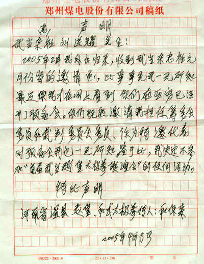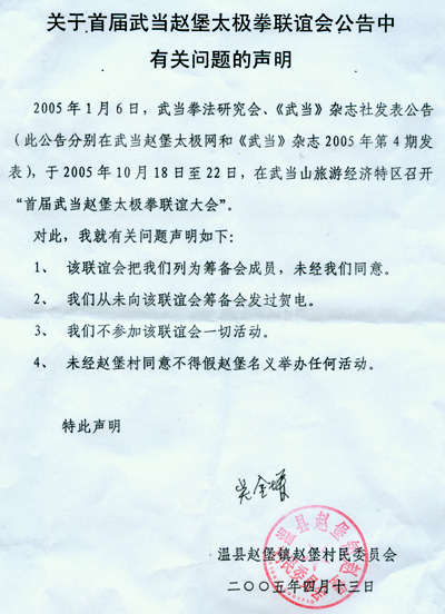 2005年2月我外出归来,收到武当杂志社元月份寄的邀请函,此事事先我一无所知,最近我才在网上看到你们在西安已经开了预备会。你们既然邀请我担任筹委会委员和裁判委员会委员,作为特邀代表对于预备会我也一无所知。鉴于此,我决定不参加“首届武当赵堡太极拳联谊会”的任何活动。
