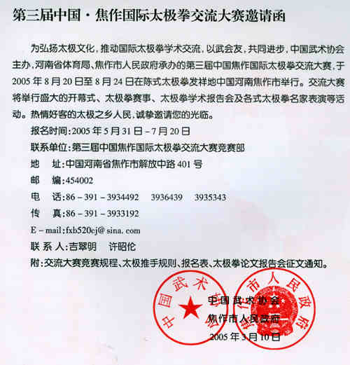 In order to develop Taiji culture,promote the international Taiji academic exchanges,make new friends and make progress,the 3rd International Taijiquan Exchange Competition in Jiaozuo,China will be held from August 20 to 24,2005 in Jiaozuo City,Henan Province,China,the birthplace of Chen Style Taijiquan.The competition is organized by the Chinese Wushu Association,and undertaken by the Henan Provincial Sports Bureau and the Municipal Government of Jiaozuo City.During the competition,there will be various activities,such as the grand opening ceremony,Taijiquan contests,lectures on Taijiquan and assessment of papers,performances of different styles of Taijiquan presented by well—known masters and SO on.The people of Jiaozuo are friendly and hospitable.We will be honored to have your presence along with your team and friends.