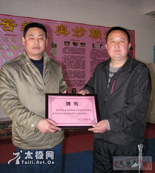初到徐州龙之健武道馆,张金鹏与陈冲便受到姜启健、李中华、董小伟先生以及当地交通银行、财政局负责人、房地产老总等当地高层人士的盛情款待,大家一起推杯论盏,把酒论太极,徐州人的热情和太极挚友的真诚让人颇为感动。其间,姜启健高兴之余郑重聘请陈冲为龙之健武道馆的顾问。因为姜、陈二人以太极结缘,神交已友,陈冲也聘请姜启健为陈家沟太极拳武校顾问。