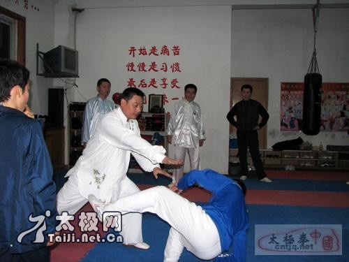 第二天,张金鹏、陈冲与姜启健先生一起来到他的龙之健武道馆。每周二、四、六是武馆学员们跟随姜启健老师定期学拳的日子。只见馆内早已云集着许多刻苦练拳的学员,有退休在此习拳健身的老者,也有事业有成渴望身心和谐的中年人,更有意气风发的青少年,他们用舒展的拳姿和惬意的笑容诉说着太极拳给他们带来的无尽快乐与和谐健康。为了让这些年纪不等、基础不一的学员都能尽快踏入太极殿堂,姜启健先生多年来因人施教,摸索总结出一套自己独特的教学法。同时,他将套路学习与太极散手、技击用法等结合起来,让学员在套路学习中感悟拳理,拳技日日精进。为了满足不同武术爱好者的要求,他还在教授太极拳的同时,聘请资深知名教练和全国冠军开设了跆拳道、散打、少儿武术等,学员们已达数百名,成为当地首屈一指的武术学校。 在馆内墙壁上,只见赫然写着这样几行字:开始是痛苦、慢慢成习惯、最后是享受,让我们再来一次。其实,这不仅是姜启健先生对学员们的殷切寄语,也是多年来他自己始终如一的实践。用姜启健先生的话来说,他自从走上太极之路,就是由苦及甜,不断跋涉的漫长旅程。