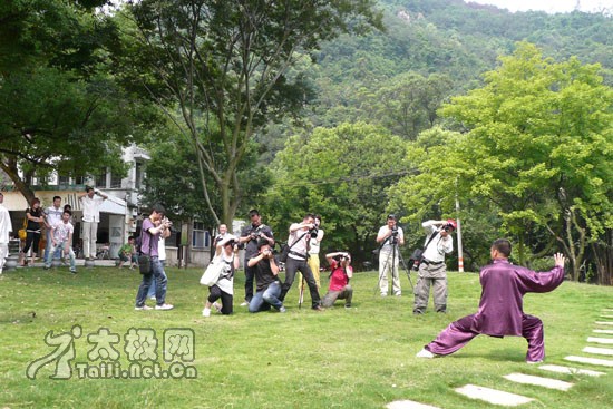 | 陈上党的拳姿引来了多门“长枪短炮” 2009年5月30日,温州市陈上党陈式太极养生会所的20多名会员,利用周末时间,相约驾车来到温州市较有名气的景区——仙岩寺旅游。 陈上党在示范讲解 带领学员们集体练拳 陈上党在给学员纠正动作 |