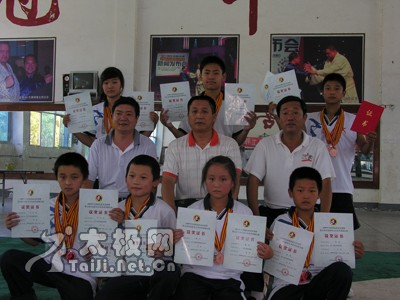 前排左起:雒燕、石章壁、邱治明、梁森 后排左起:毕鹤鸣 、闫云鹏 、杜宇、杜黎明 2009年6月18--22日,陈家沟武术院8名学生在教练李志强的带领下参加了在江苏太仓举办的第七届全国武术之乡武术套路比赛取得1金3银14铜共18枚奖牌的好成绩,受到县体育局领导的表彰。陈家沟武术院是代表武术之乡温县参加了此次比赛。  与体育局领导合影 全国农民武术比赛暨第七届全国武术之乡武术套路比赛由国家体育总局武术运动管理中心、江苏省体育局主办,太仓市政府承办。在为期三天的比赛里,来自全国23个省市区、57支代表队的近400名运动员参加了比赛。参赛运动员共参加了A、B、C、D四个组别的数十个武术项目的比赛,各种各样的传统拳、传统棍、传统剑、传统枪、传统刀法表演,让现场观众目不暇接。 毕鹤鸣 女子A组传统剑 一等奖 杜宇 男子B组传统剑 二等奖 石章壁 男子A组传统拳 二等奖 雒燕 女子A组传统剑 二等奖 杜黎明 男子B组传统拳 三等奖 杜宇 男子B组传统拳 三等奖 闫云鹏 男子A组传统拳 三等奖 梁森 男子A组传统拳 三等奖 邱治明 男子A组传统拳 三等奖 杜黎明 男子B组传统剑 三等奖 闫云鹏 男子A组传统剑 三等奖 梁森 男子A组传统剑 三等奖 石章壁 男子A组传统剑 三等奖 邱治明 男子A组传统剑 三等奖 雒燕 女子AB组传统拳 三等奖 毕鹤鸣 女子AB组传统拳 三等奖 集体对练 :杜黎明 石章壁 三等奖 杜黎明获体育道德风尚奖运动员 |