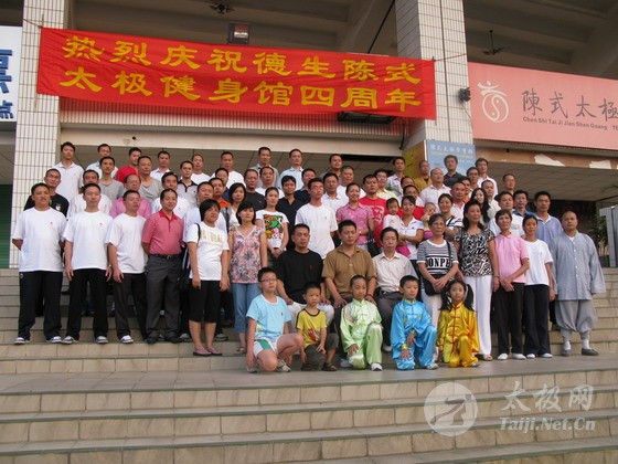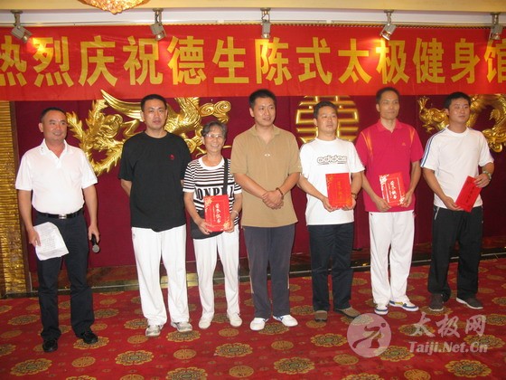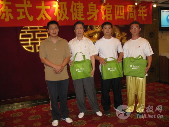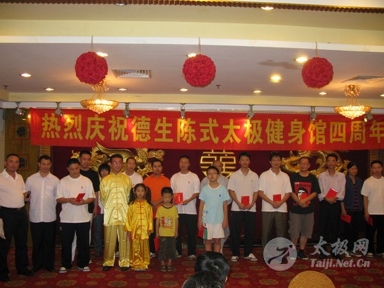 拳馆四周年 高朋满座,来自香港陈氏太极总会的陈国华主席,深圳陈家沟陈氏太 极拳馆的杨宝忠馆长,及我馆自已培养的教练员现在惠州传拳的教练 韩伟华。另有来自广州及东莞本地的众拳友及学生前来相贺。 晚宴在体育中心文园酒店进行,首先由韩军生馆长进行了日热情洋 溢欢迎词。并介绍了因自己在 名,“陈德生”,所以在东莞陈式太极健身馆前冠名“德生”。 接下来主持人宣布了 了各类奖项。各位嘉宾也获得了由七彩云南普洱有限公司赠送的精美 礼品和茶叶。东莞、深圳、惠州等地市的太极拳教练和少 年学员进行了现场表演。